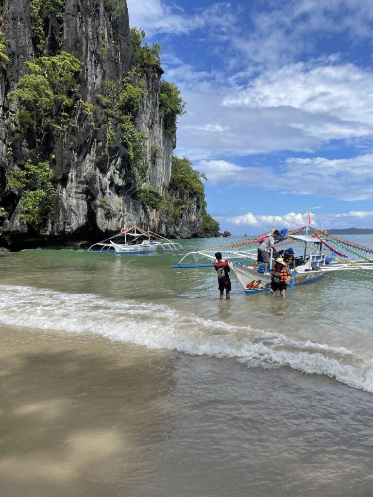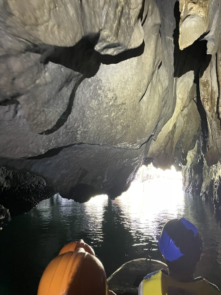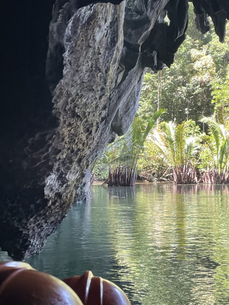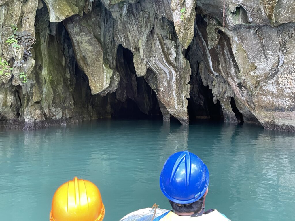 Quasi altre due ore di pulmino spaccaossa , attraversando trasversalmente per 80 km L isola lussureggiante ed arriviamo a Sabang, dall’altra parte. Qui c’è il controllo coastguard dei permessi , e dopo breve attesa ci imbarchiamo sulle barche che in 15 min di mare ( con pioggia e vento…) , ci sbarcano su una bella spiaggia nei pressi della foce del fiume sotterraneo .