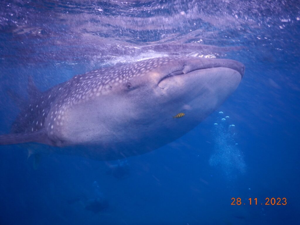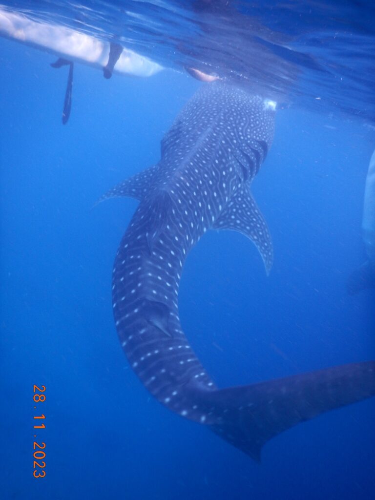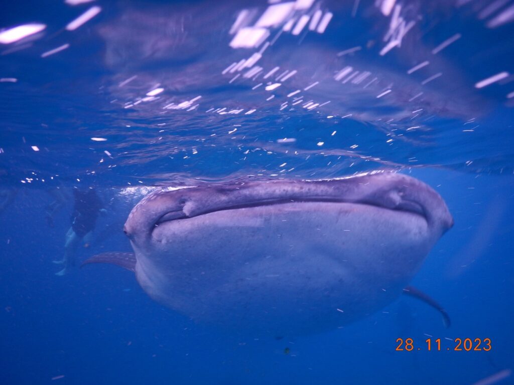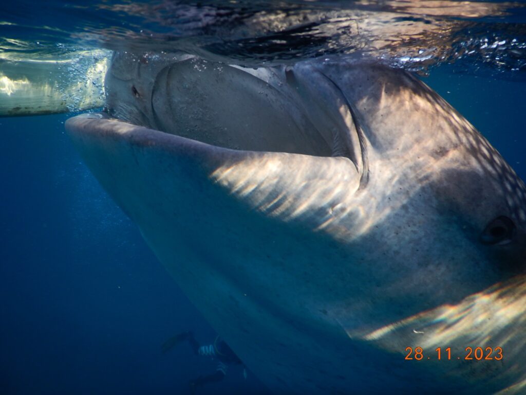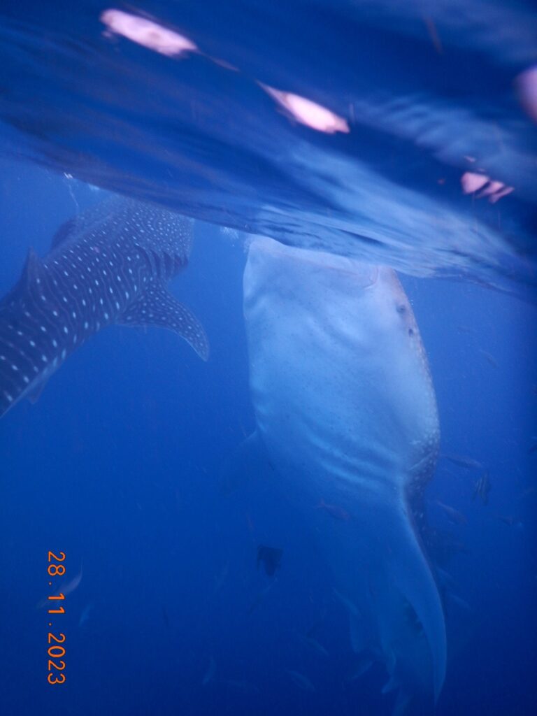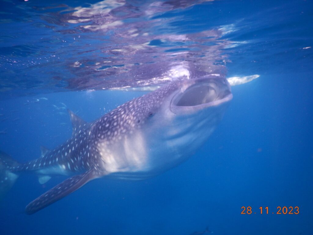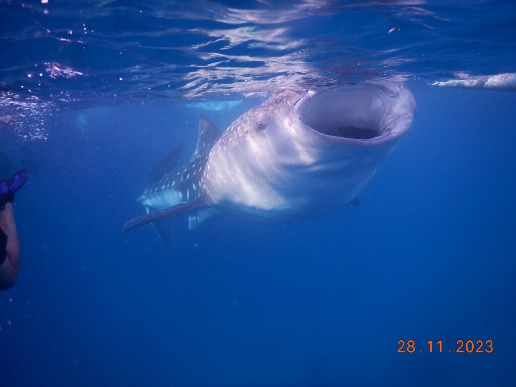 Sono bellissimi, enormi, maculati , dei veri e propi squali dalla bocca enorme, ma per fortuna senza denti. Potrebbero abbocconare un uomo intero , ma si accontentano di plancton e credo farina di pesce che gettano in acqua per attirarli.