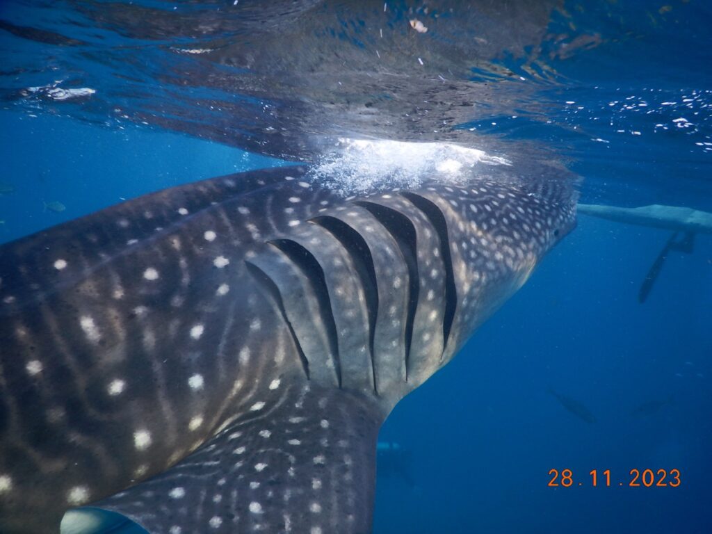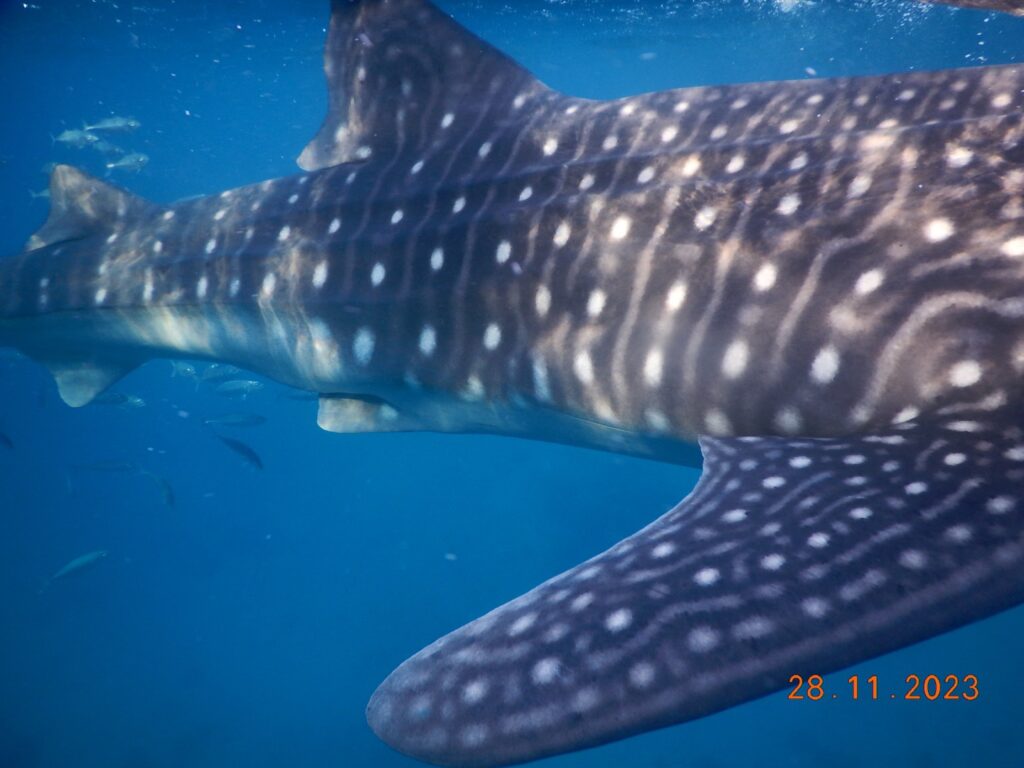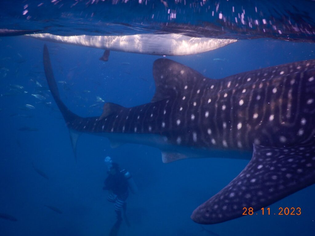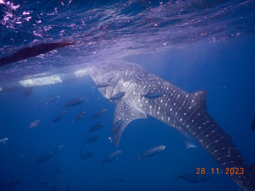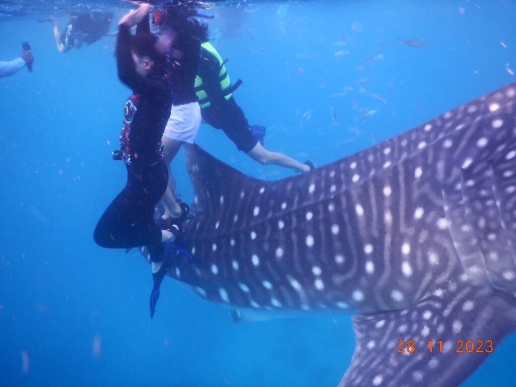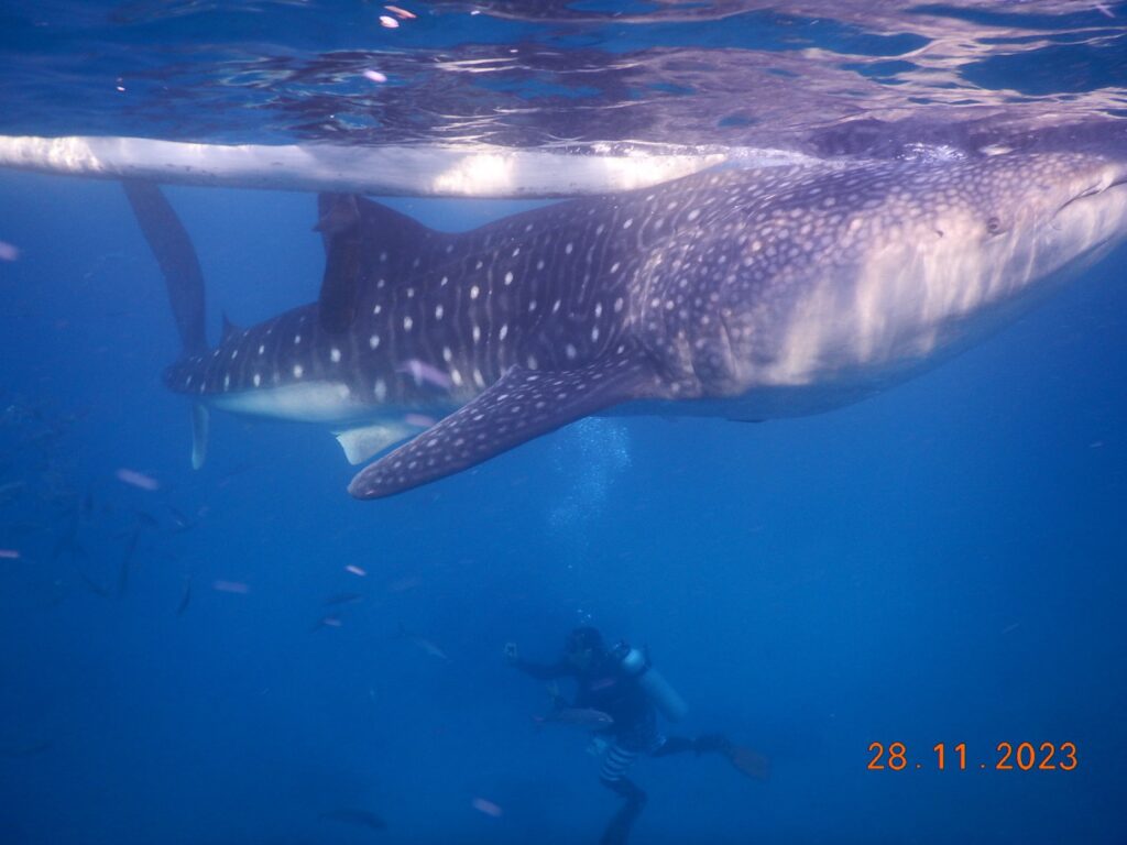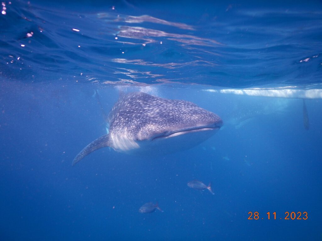 Sono bellissimi, enormi, maculati , dei veri e propi squali dalla bocca enorme, ma per fortuna senza denti. Potrebbero abbocconare un uomo intero , ma si accontentano di plancton e credo farina di pesce che gettano in acqua per attirarli.