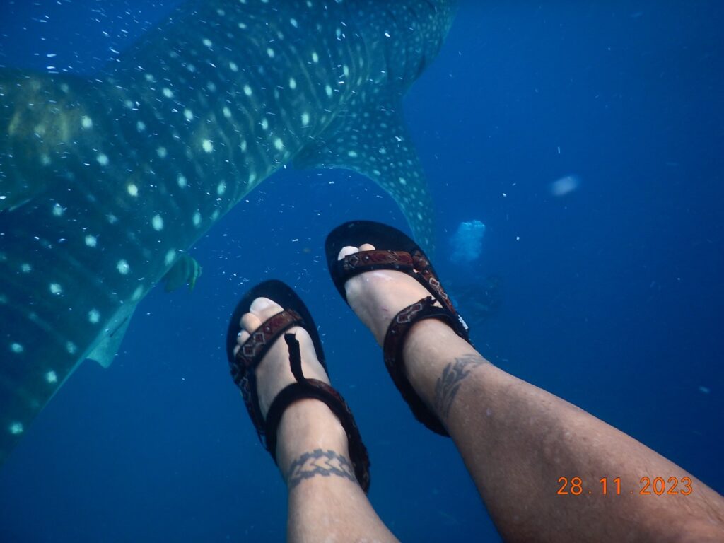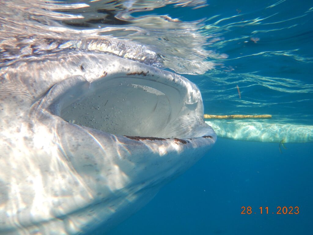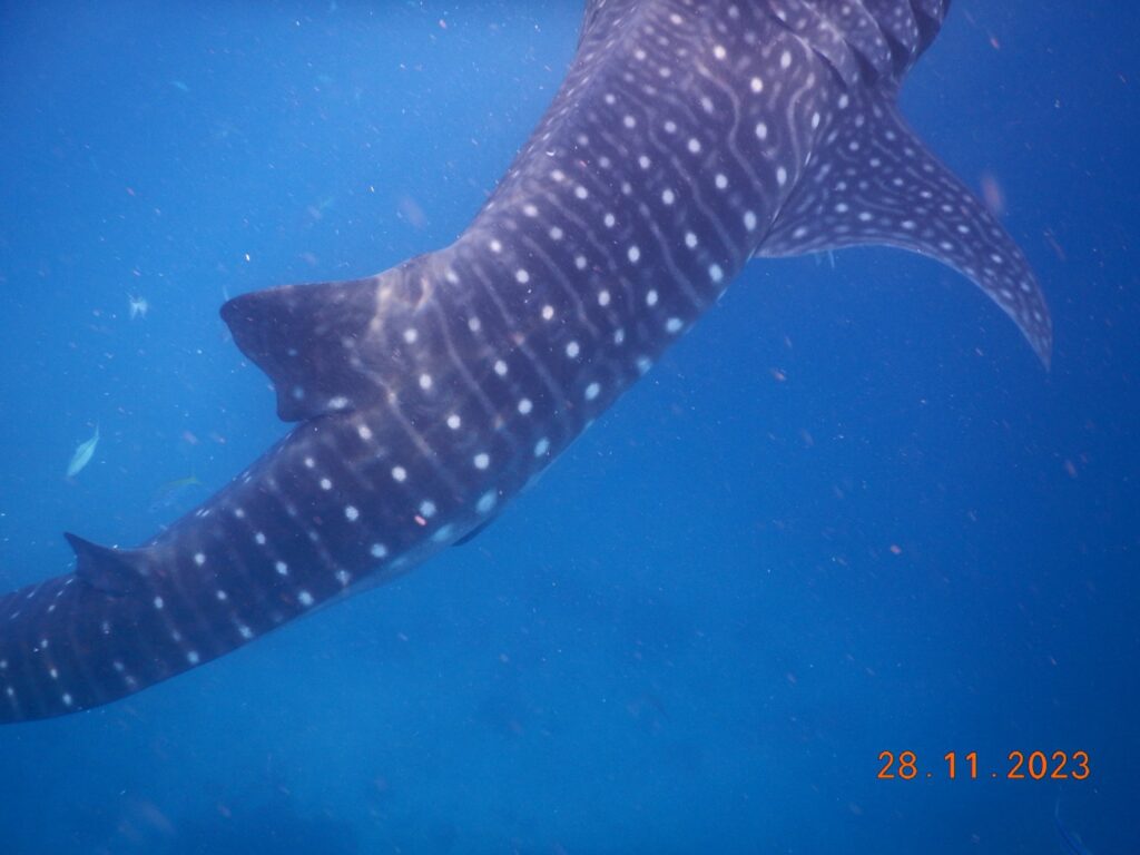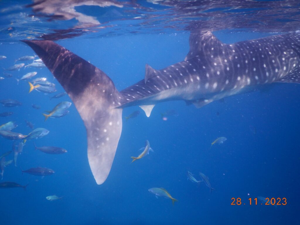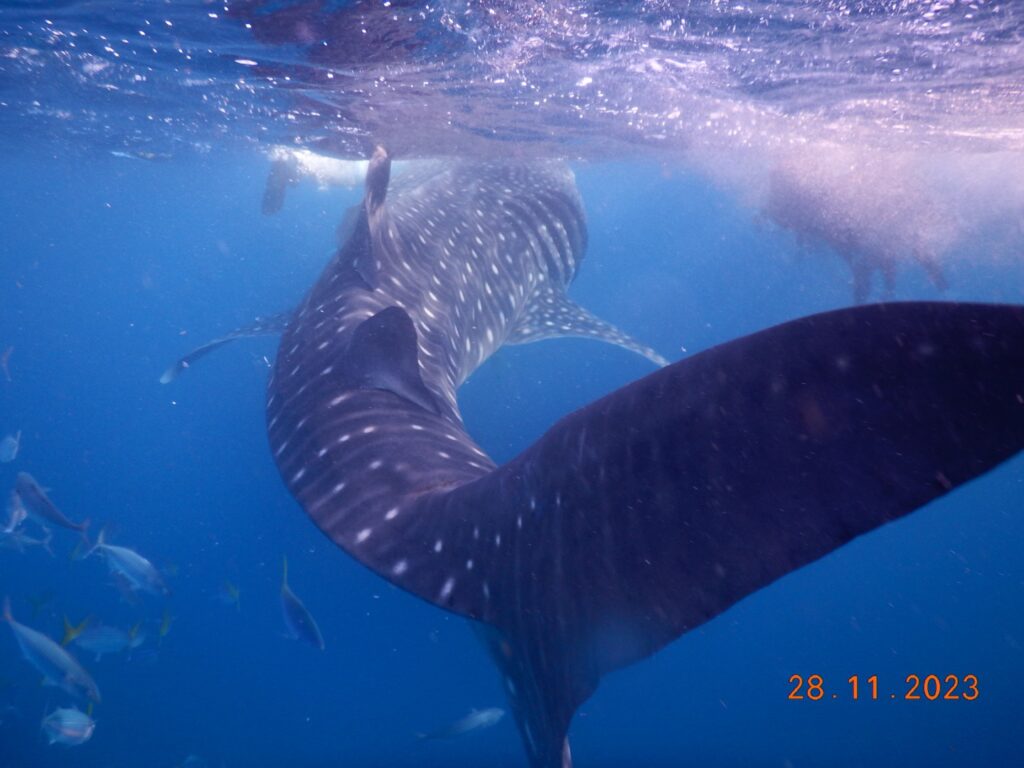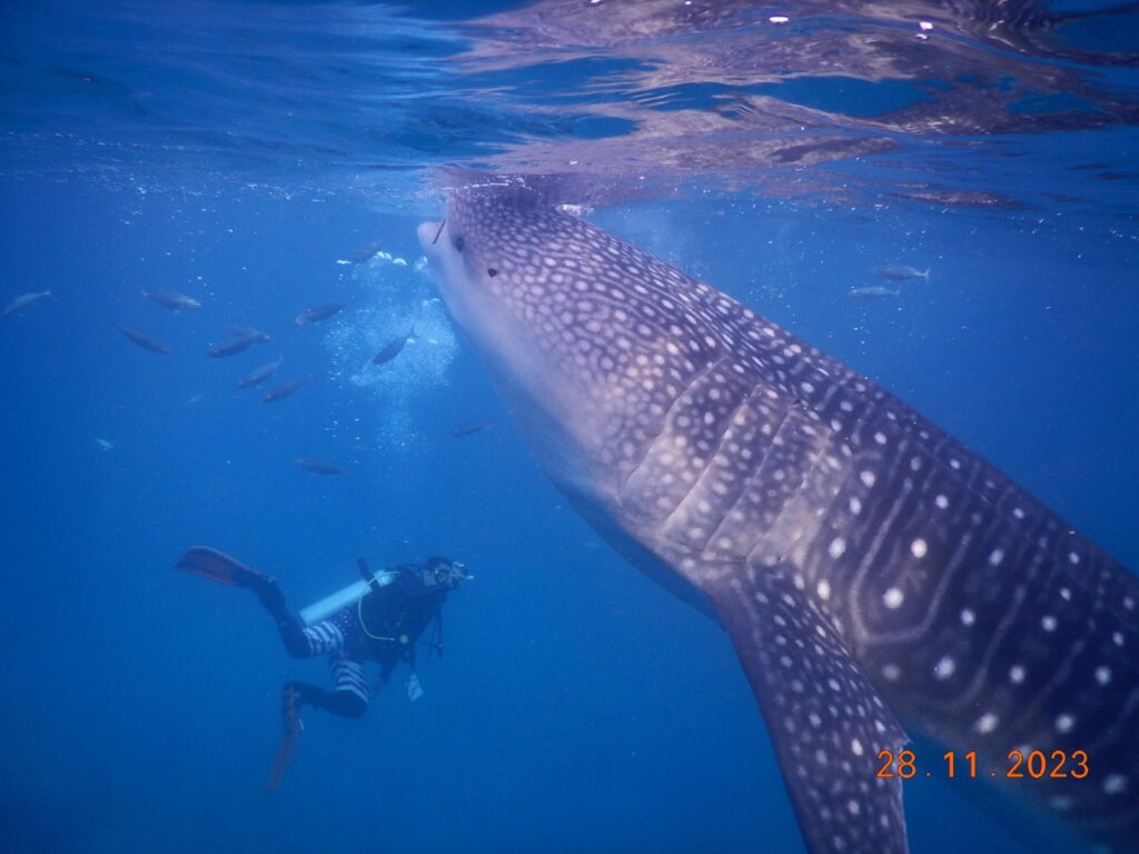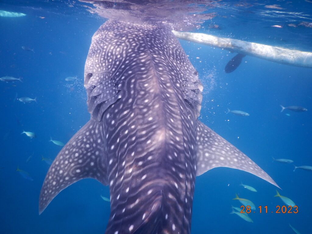 Sono bellissimi, enormi, maculati , dei veri e propi squali dalla bocca enorme, ma per fortuna senza denti. Potrebbero abbocconare un uomo intero , ma si accontentano di plancton e credo farina di pesce che gettano in acqua per attirarli.