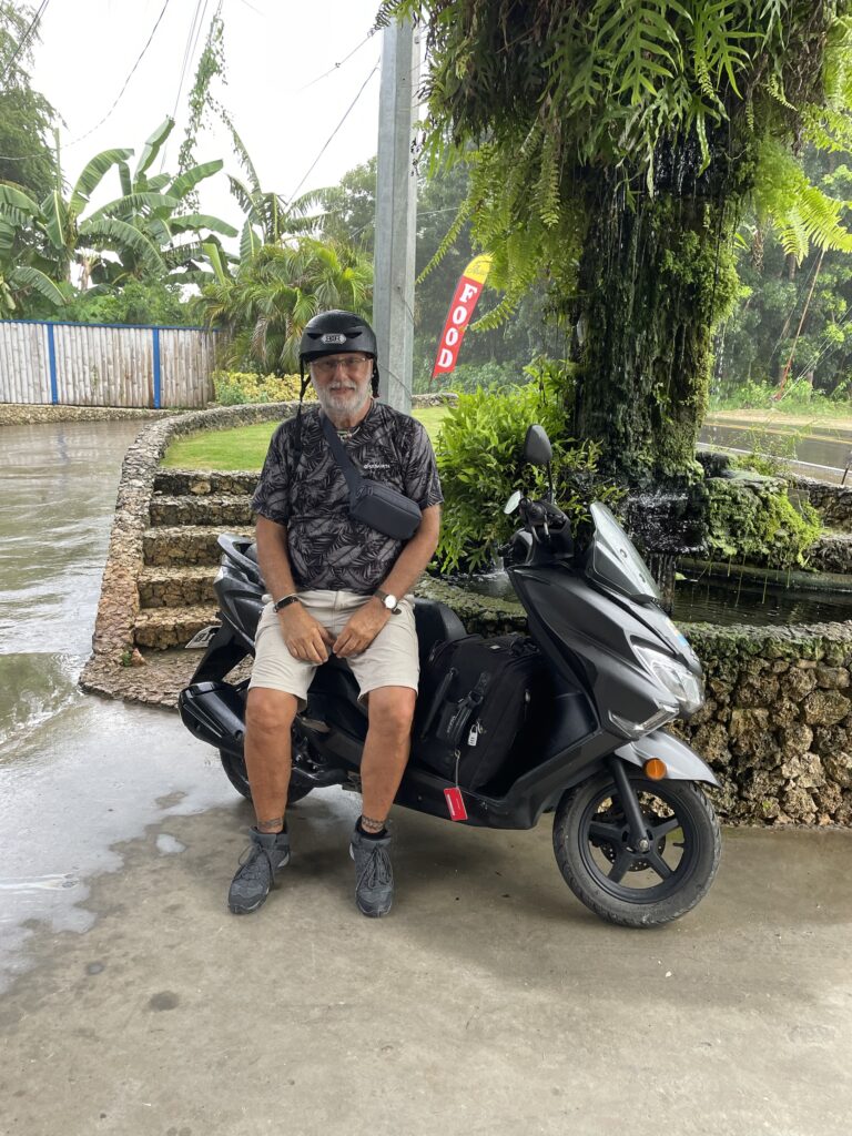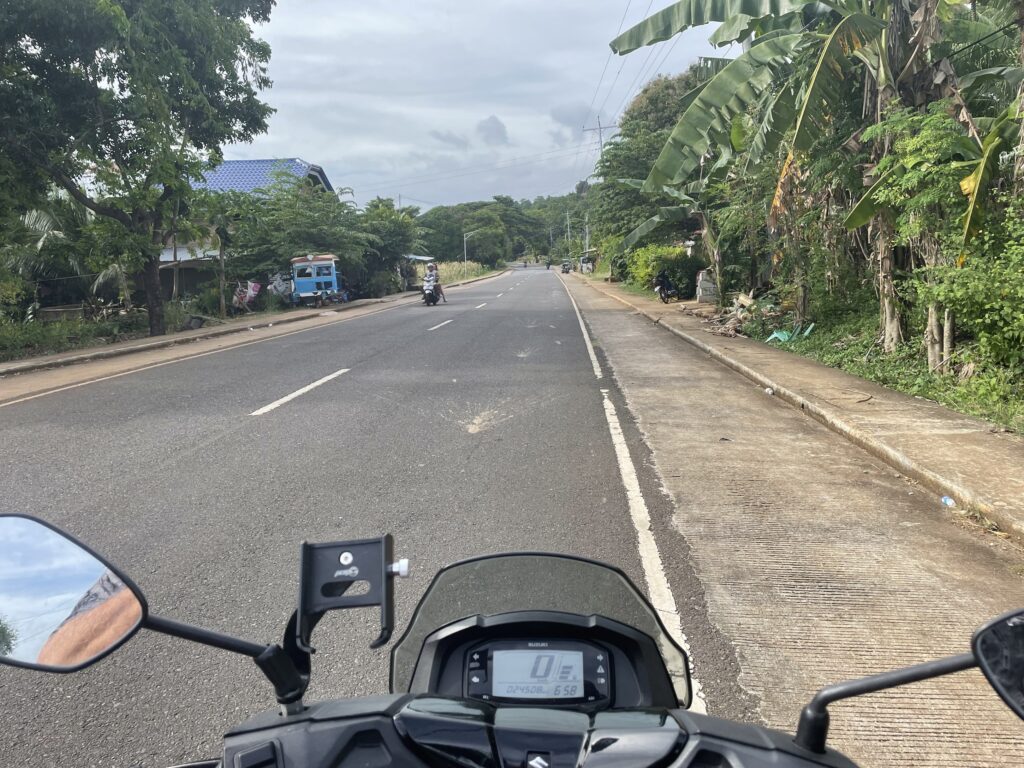 Il motorino, noleggiato subito allo sbarco , è fondamentale per muoversi. Non ci sono “paesi” è tutto dilatato lungo L unica strada perimetrale che fa il giro dell isola, che è grande. Traffico quasi inesistente, strada buona, larga, perfetta senza buche, qualche trike qualche furgoncino, ma pochi, solo lenti motorini. Per passare dalla lavanderia, dove ho portato la roba sporca ( 2 kg per 2 euro) , al ristorante , al negozietto, al baretto ci vanno 1 -2 km , anche 3 km, a piedi sarebbe devastante muoversi.