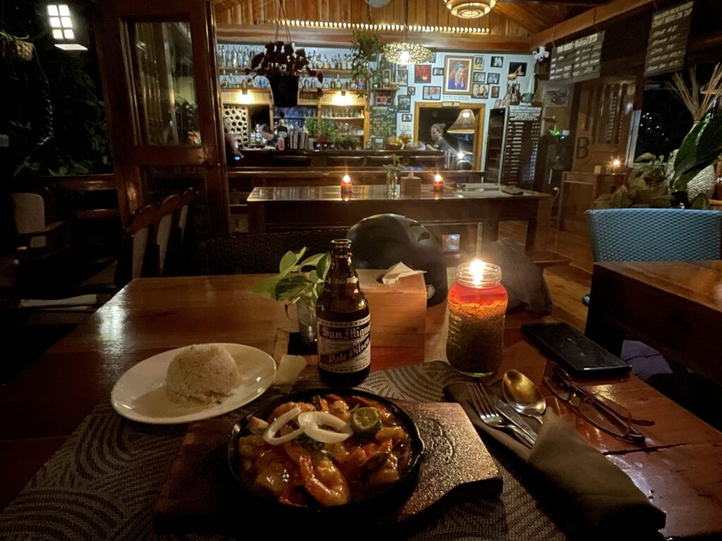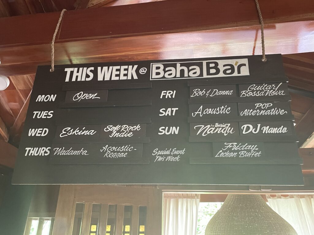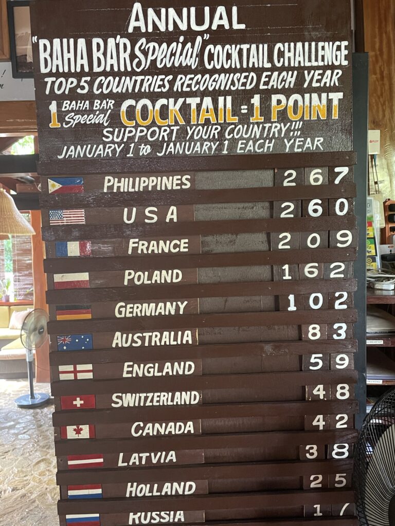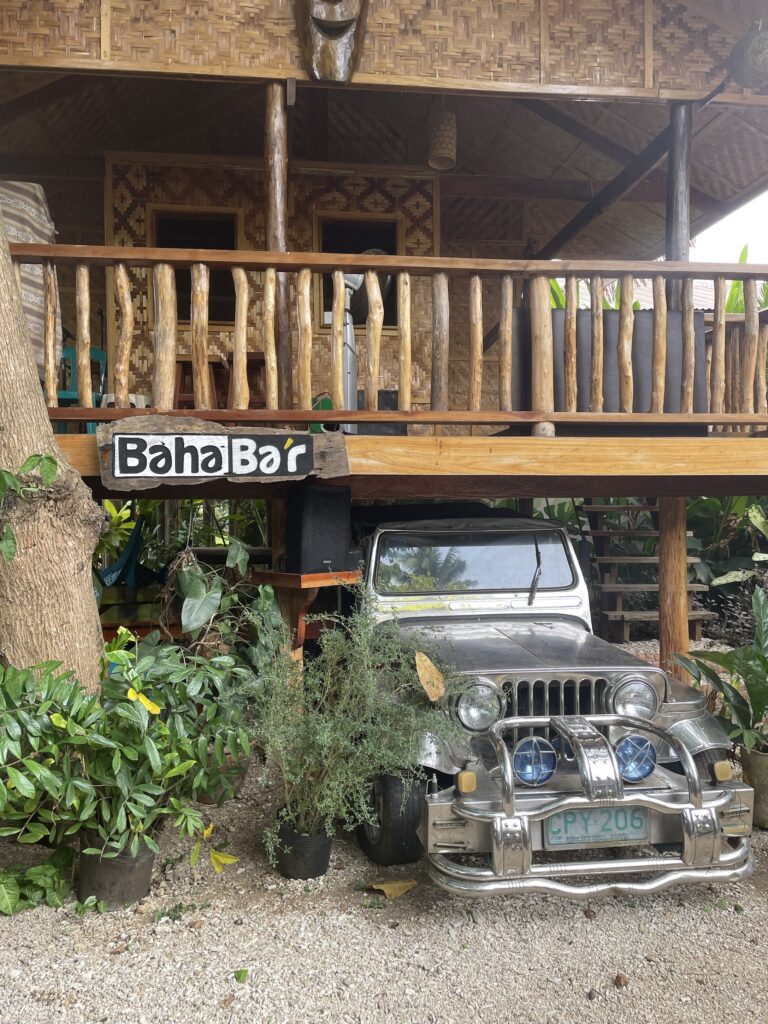 Baha Bar, ci si entra solo scalzi, nel fascinoso e tropicale bar/ ristorante a due piani tutto in legno, anzi 4 bei tipi di legno, tutti nativi dell isola. Candele, Cibo ottimo, cocktail strepitosi, musica soft dal vivo, atmosfera rilassante , divanetti comodi, cameriere gentili. Davvero non c’è bisogno di altro, forse un sigaro , ma non me lo posso più permettere e comunque qui non si fuma! L ho promosso a mio bar preferito qui a Siquijor, ci vengo spesso per uno mango shake o a cena. C’è la classifica annuale dei bevitori di cocktail per nazione, Italia non classificata…