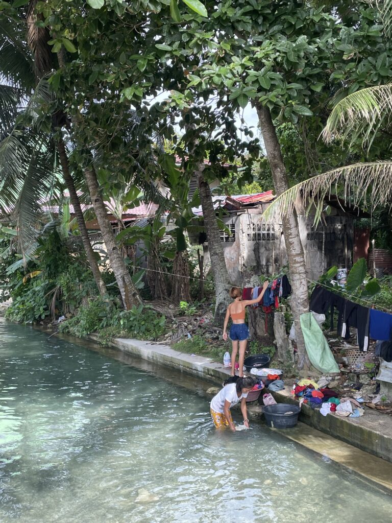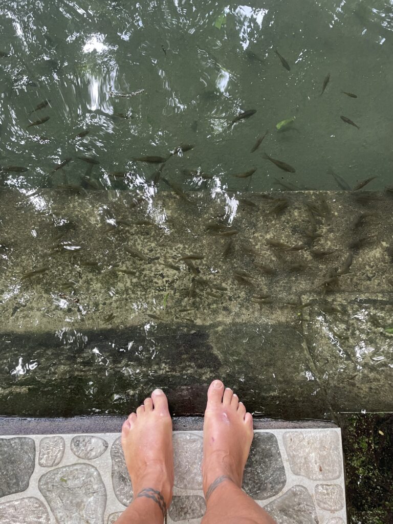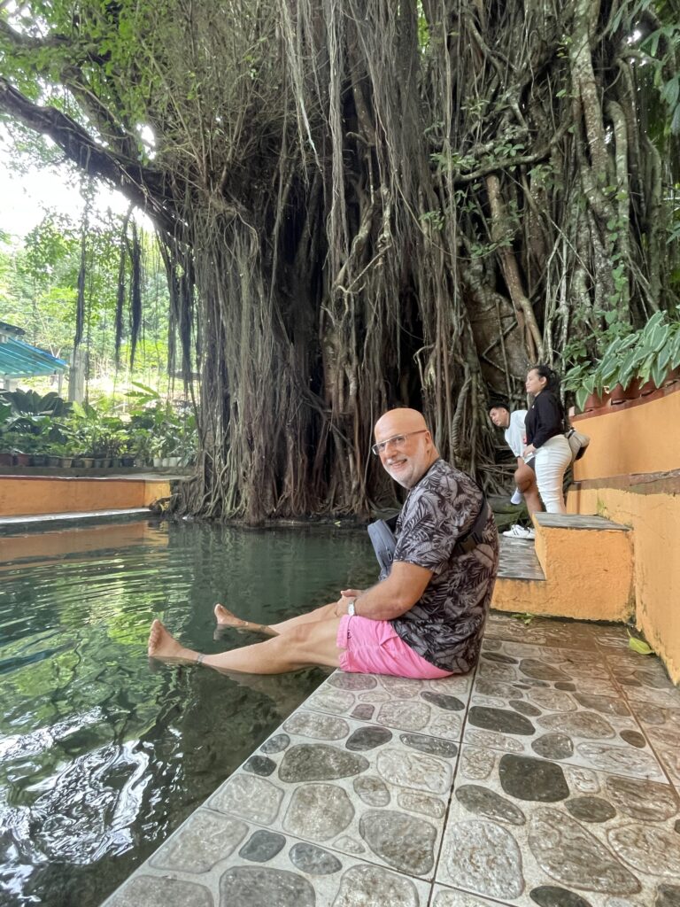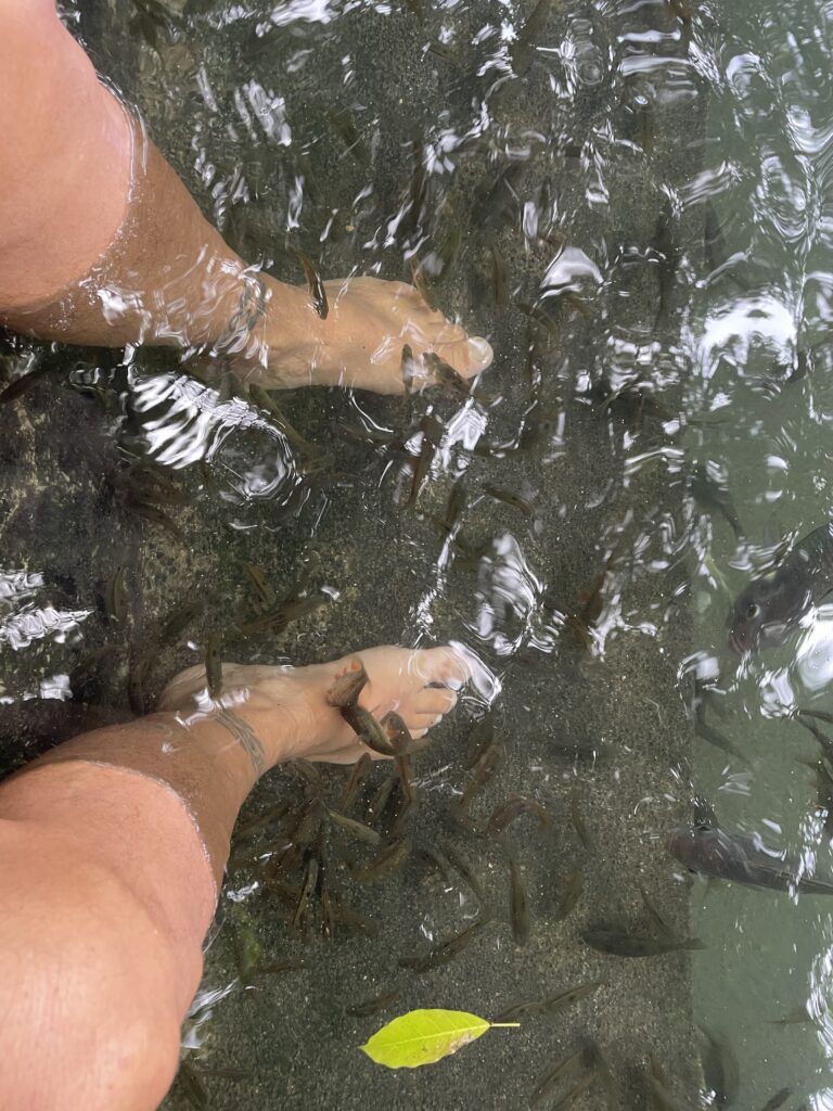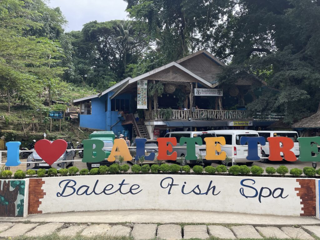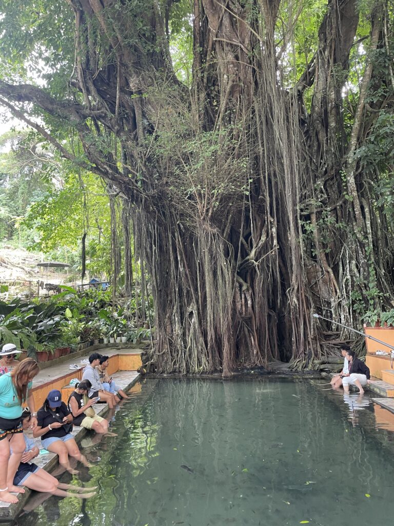 Raggiungo il vecchio e secolare (400 anni) Balete tree, albero sacro ai sacerdoti ed agli spiriti, sotto il quale c’è una pozza di acqua dolce con tanti pesciolini grandi e piccoli che ti fanno il peeling se metti i piedi in acqua. La sensazione dei dentini che ti grattano la pelle è un po’ fastidiosa per me. L avevo già provato in Cambogia, nei bar dove bevi birra con i piedi in ammollo, ma li i pesci erano piccolissimi e ti facevano solletico. Qui sono più grandi e voraci, ti grattano proprio i talloni(!). Comunque posto magico, sereno, rilassante.