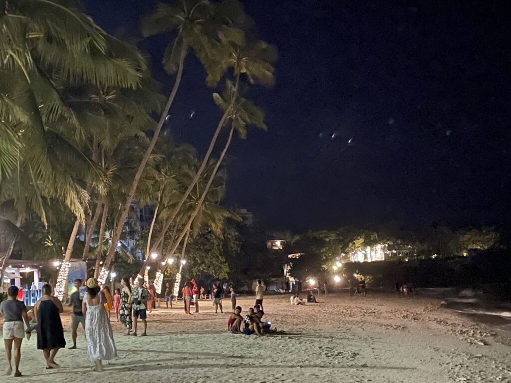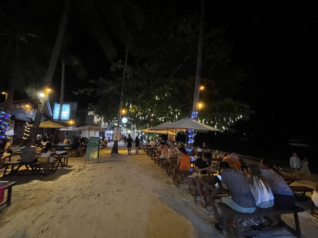 Ma dopo il tramonto, il posto cambia e si trasforma. Barbecue di pesce sulla spiaggia, tavolini sulla battigia, luci soffuse, musica dal vivo dappertutto, candele e fiaccole, venditori, gente che passeggia , insomma una località di mare, turistica ma vivace.