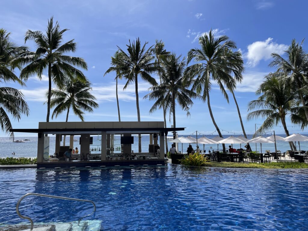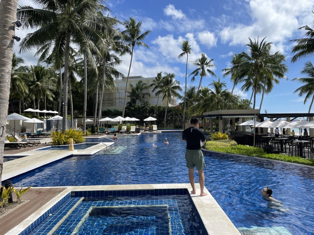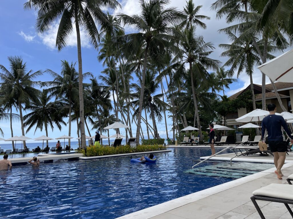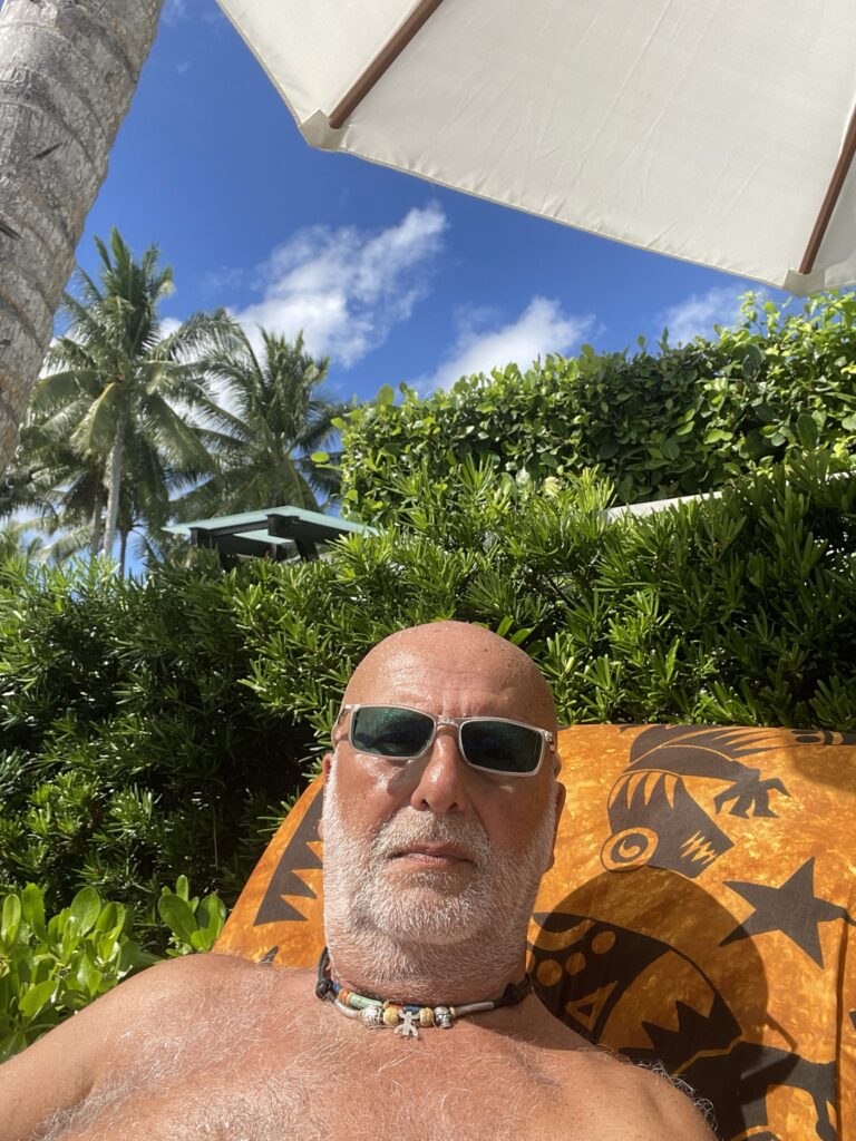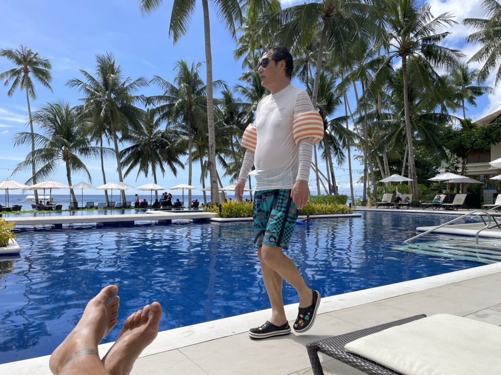 Oggi giornata di relax totale, basta scooter. Invece di andare alla spiaggia, che è per il popolo, opto subito per L hotel 5 stelle, le sue piscine ed i comodi lettini. Entro con fare deciso all Henna Resort, il più bello qui, la security lato spiaggia si preoccupa solo di non far entrare venditori o filippini improbabili , io sono qui serio occidentale ed anziano con barba bianca, e passo senza problemi. Alla portoghese. E mi piazzo alla grande con il mio pareo con i geki su un lettino imbottito, con piscina, jacuzzi e spiaggia davanti. Ve L ho detto che i geki portano fortuna…È pieno solo di coppie e famiglie coreane, benestanti , che fanno tutti il bagno in piscina con la muta completa, nera…mah!
