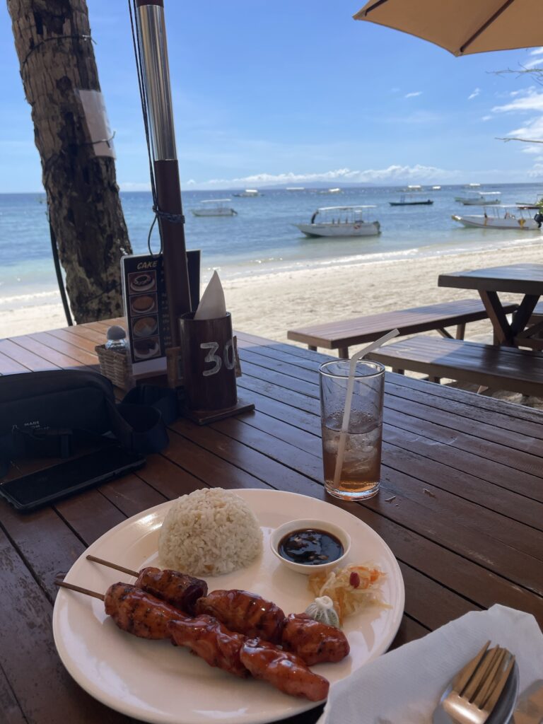 Ad ora di pranzo, malgrado la brezza non si resiste e mi rifugio in uno dei ristorantini lungospiaggia per dei spiedini di pollo e birra.
