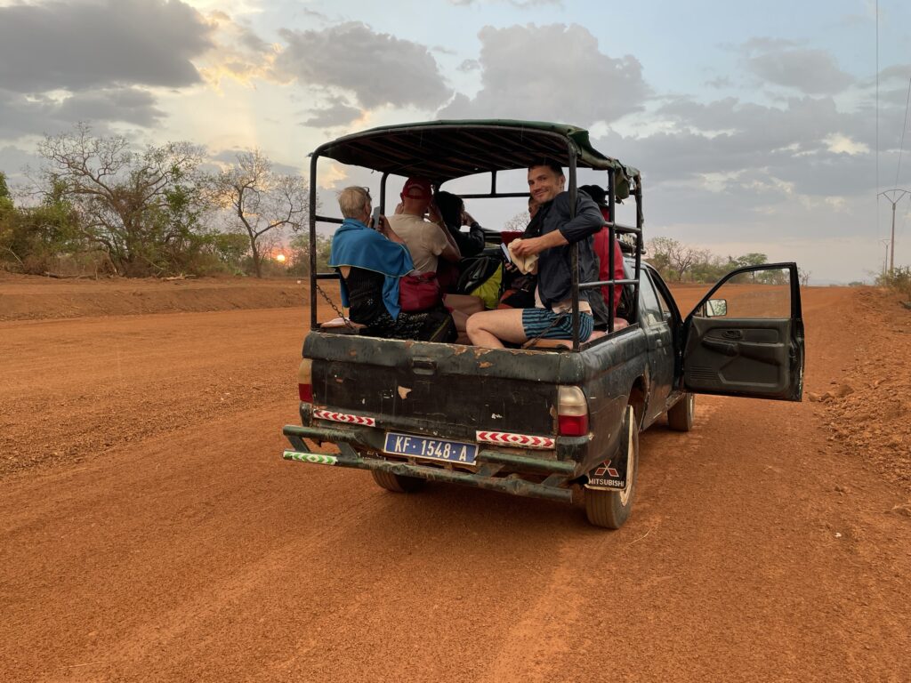 Alle 15 con un fuoristrada 4×4 telonato imbocchiamo la pista in terra rossa verso la cascata Dindifelo. Sono 23 km di polvere e tolèondulè , quelle gobbe costanti sulla terra battuta che fanno tremare le sospensioni.
