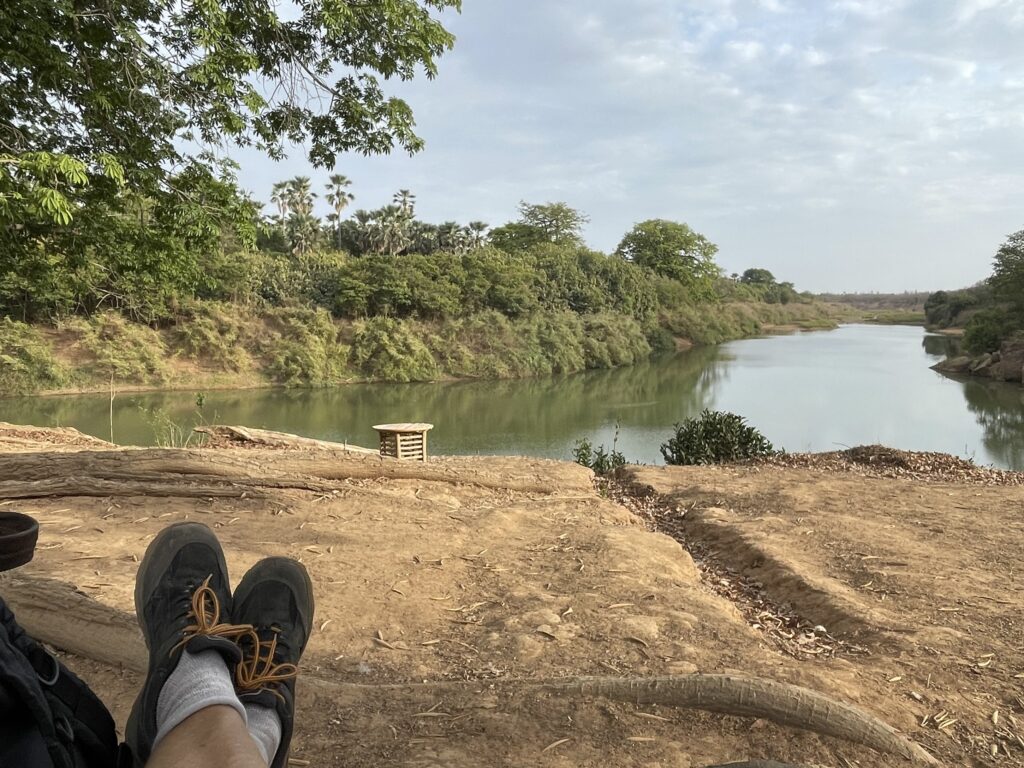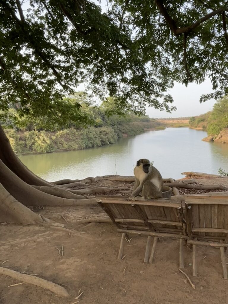 Le chiavi del bungalow che ci spartiscono hanno , come portachiavi, delle grandi pile, indispensabili per raggiungere la camera, e per illuminare le scimmiette che ti attraversano il sentierino. Sono a Le Wassaodu, un camp sistemato su una grande ansa del fiume Gambia. Dalle sdraio di bamboo, sotto la ceiba (sono gli alberi con grosse radici), con una doverosa birra fresca in mano, si ammirano ad una trentina di metri, due oziosi ippopotami che pascolano nell’acqua quasi ferma del fiume, tirando fuori solo le orecchie, gli occhi e le narici. Le scimmiette attorno, curiose, ti osservano. I coccodrilli sono un po’ più il la, si deve prendere una piroga per vederli. Il panorama è rilassante, aperto, la foresta che costeggia il fiume rilascia i richiami monotoni della fauna nascosta dentro.
