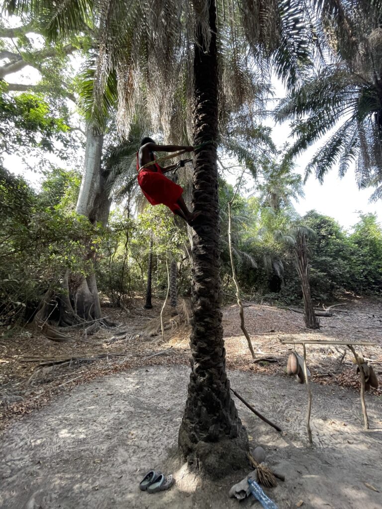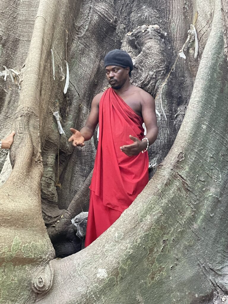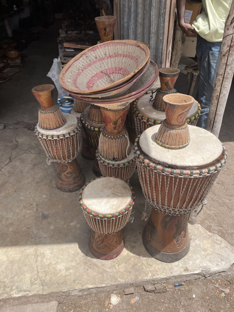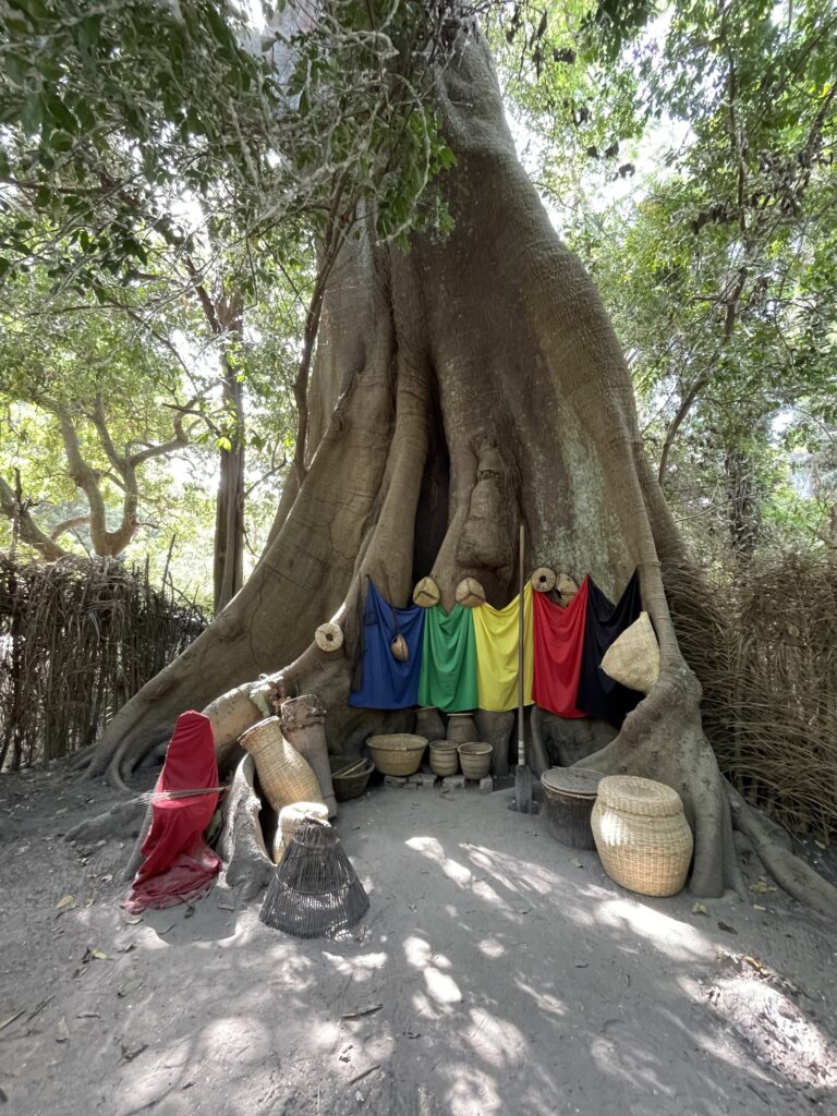 Concludiamo la giornata fermandoci al museo all’ aria aperta della cultura Djola, L etnia che vive qui. Sotto gli incredibili alberi fromager ( quelli che io chiamo ceibe , che è il nome sudamericano) ci fanno dimostrazioni di utensili, tecniche di agricoltura e di cucina e di come salgono sulle palme per spillare la linfa, il vino di palma. Ci raccontano dello spirito animista e dei feticher , gli stregoni. Ci fanno provare a portare le ceste sulla testa, zappare la terra, suonare i loro strumenti. Interessante…