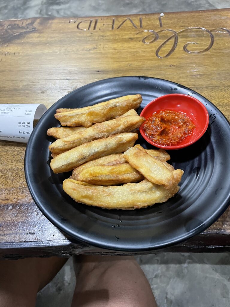Ceno con quello che trovo nell unico baretto aperto vicino al mio hotel, banane fritte con salsetta infernale ed acqua (1.2 €), diventando membro onorario dello staff di The Circle, il bar…