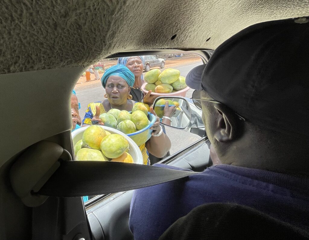 Passare i confini tra stati africani non è proprio come andare dall’ Austria alla Germania…, code, file, timbri, controlli, pagamenti, venditori, mercati, camion stracarichi , carretti con asini e….il tutto sotto il sole e a 44 gradi!