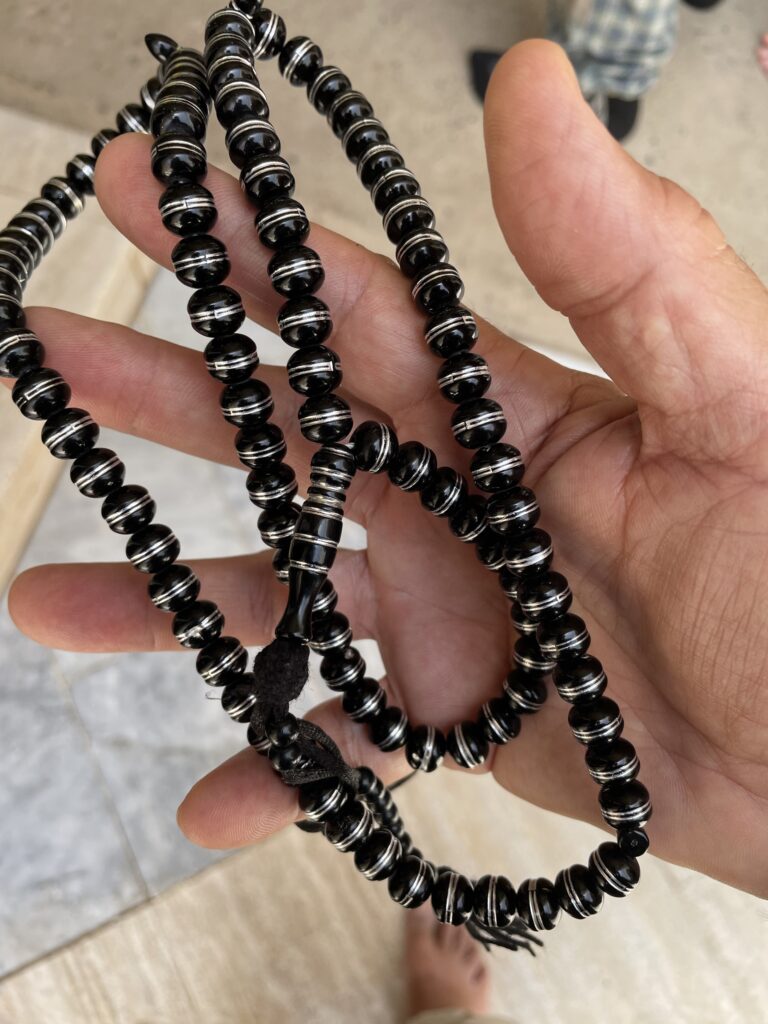 Il rosario mussulmano ha 100 perle, cioè 33+33+34 , da sgranare almeno 10 volte, per un totale di mille, le perle in basso servono per tener conto delle centinaia fatte..
