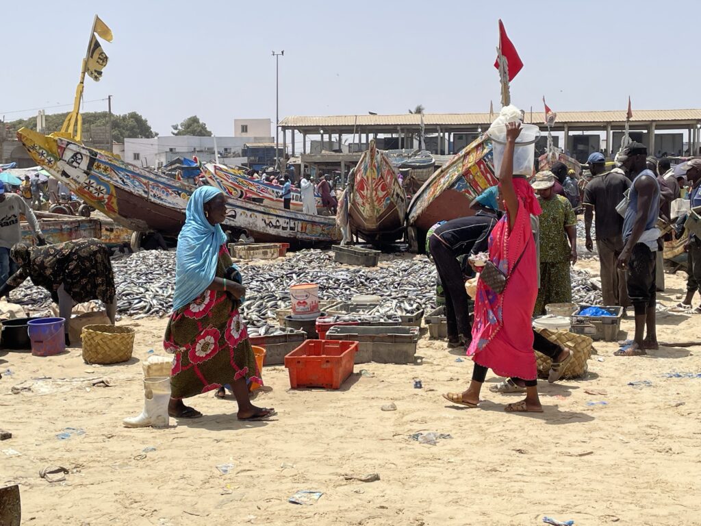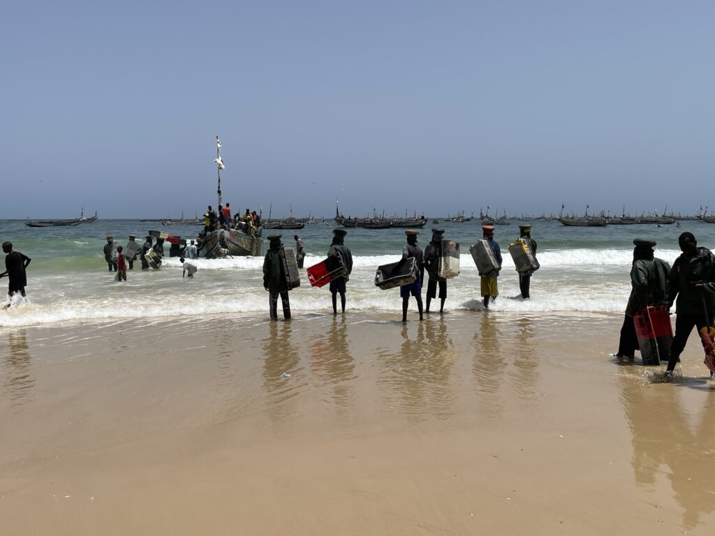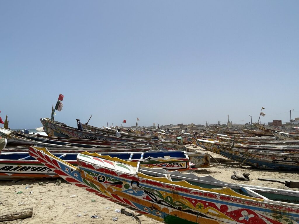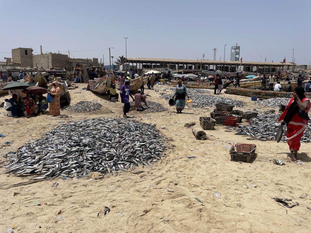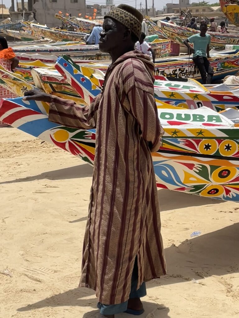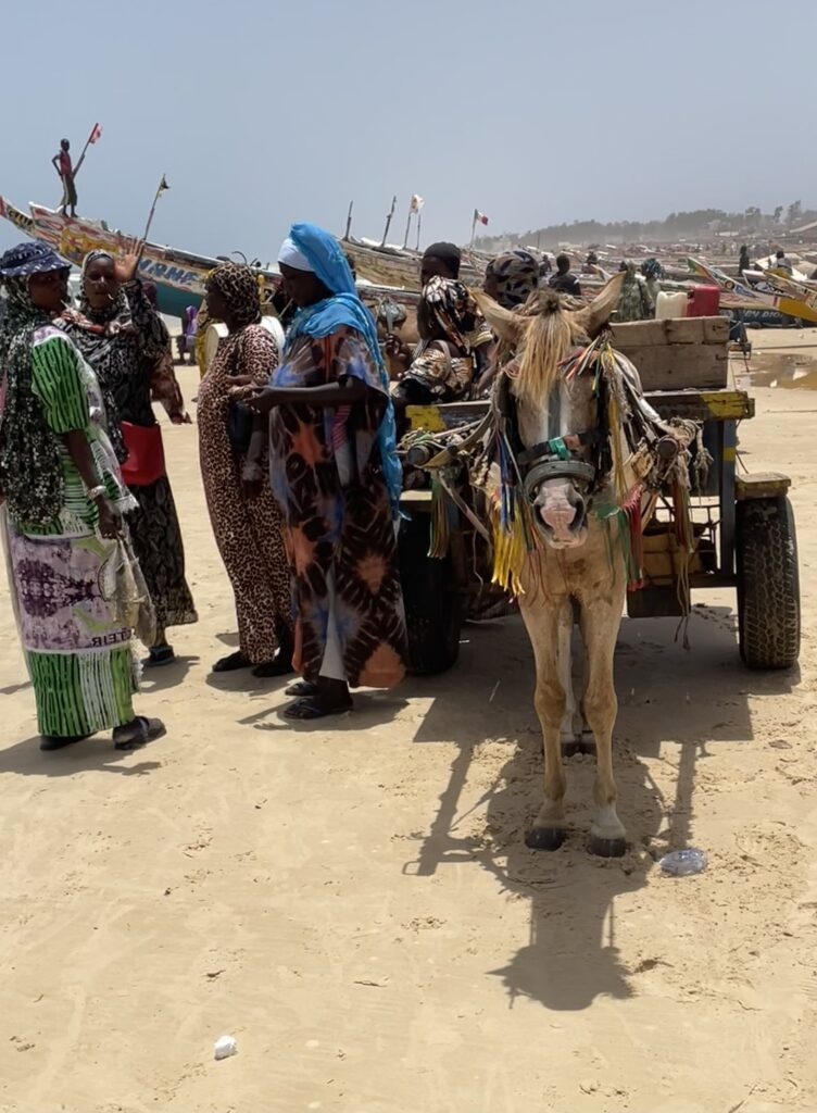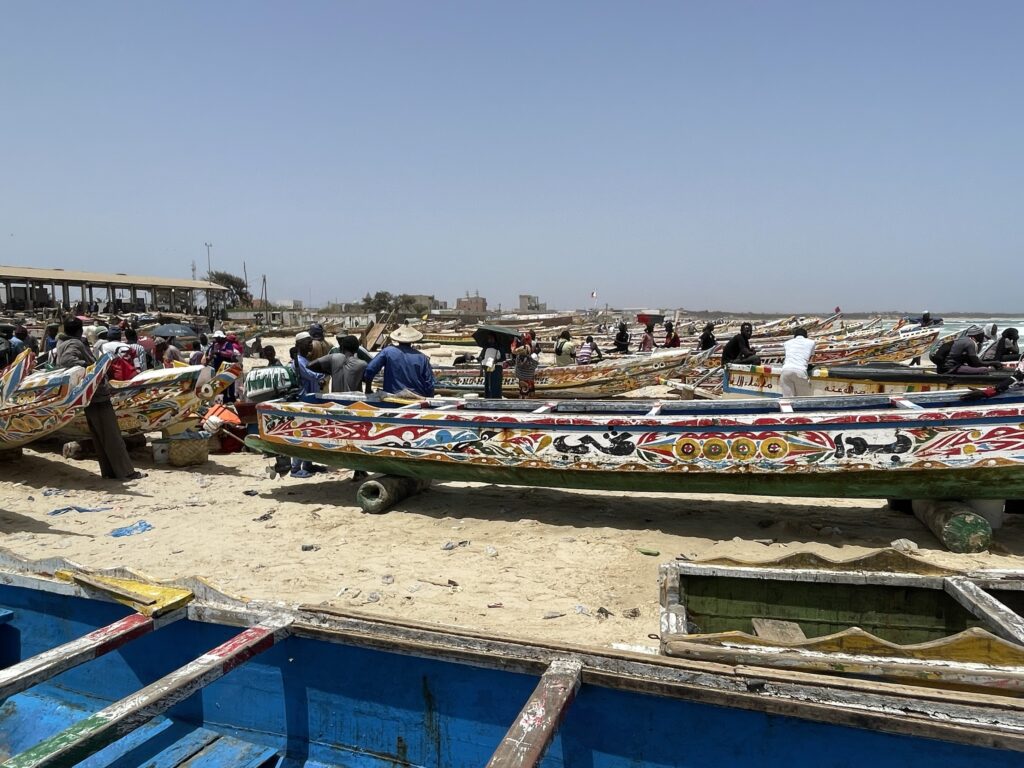 Su una bella spiaggia su cui si infrangono regolari le onde oceaniche creando creste bianche, ci sono letteralmente migliaia di barche, sulla spiaggia ed in mare, cani, carretti a cavallo, bambini che giocano, donne, migliaia di pescatori , casse di pesce fresco, mucchi di pesce che sembra avariato, distese di pesce fresco argenteo sulla sabbia , barche in costruzione, venditori, compratori, montagne di reti ammucchiate, donne che allattano, che squartano ed eviscerano pesci, un inferno che, ci dicono , si ripete ogni giorno per tutta la stagione di pesca. I pescatori , spesso in 20 o 30 su una barca relativamente piccola partono la sera e tornano al mattino tardo, a scaricare qui il pescato, ed a rimettere le barche, coloratissime a secco trascinandole sulla sabbia. I colori sono quelli del Senegal, più il bianco e l azzurro