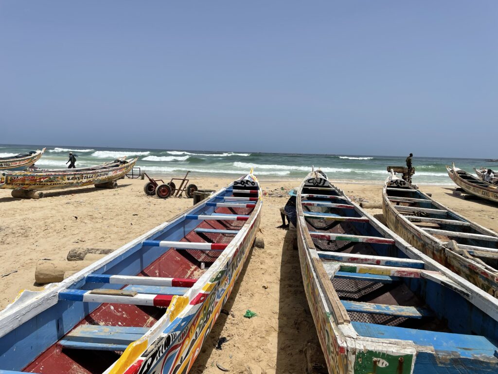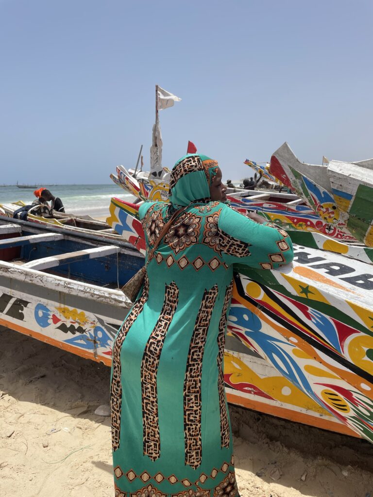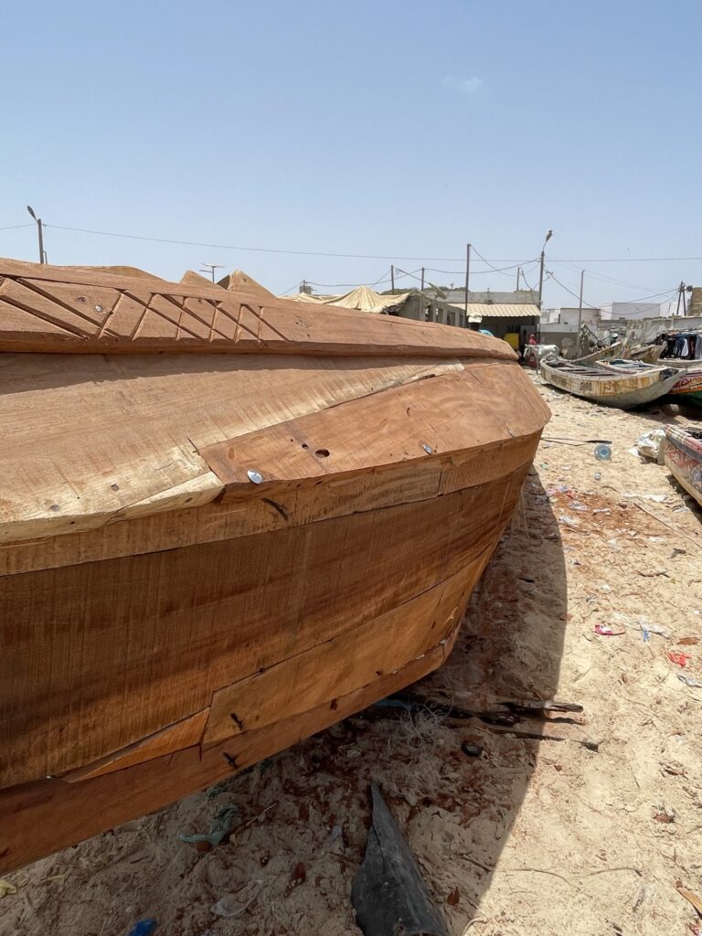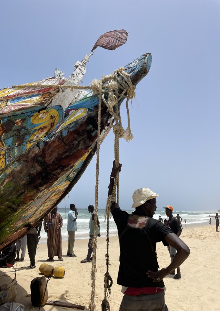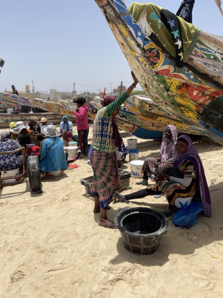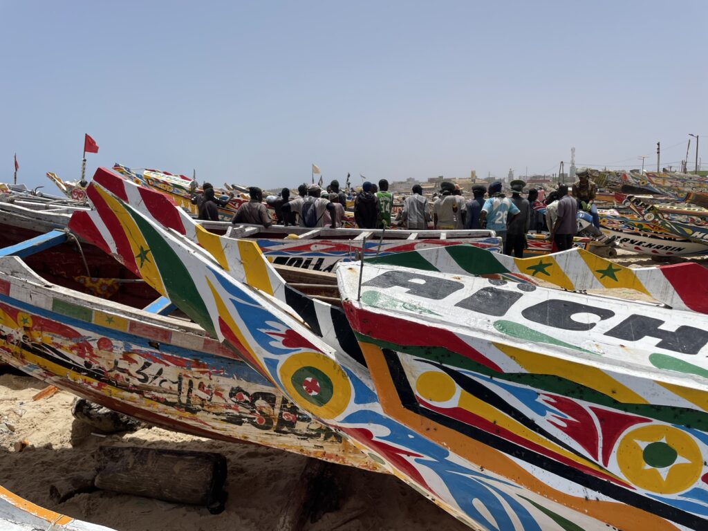 Su una bella spiaggia su cui si infrangono regolari le onde oceaniche creando creste bianche, ci sono letteralmente migliaia di barche, sulla spiaggia ed in mare, cani, carretti a cavallo, bambini che giocano, donne, migliaia di pescatori , casse di pesce fresco, mucchi di pesce che sembra avariato, distese di pesce fresco argenteo sulla sabbia , barche in costruzione, venditori, compratori, montagne di reti ammucchiate, donne che allattano, che squartano ed eviscerano pesci, un inferno che, ci dicono , si ripete ogni giorno per tutta la stagione di pesca. I pescatori , spesso in 20 o 30 su una barca relativamente piccola partono la sera e tornano al mattino tardo, a scaricare qui il pescato, ed a rimettere le barche, coloratissime a secco trascinandole sulla sabbia. I colori sono quelli del Senegal, più il bianco e l azzurro