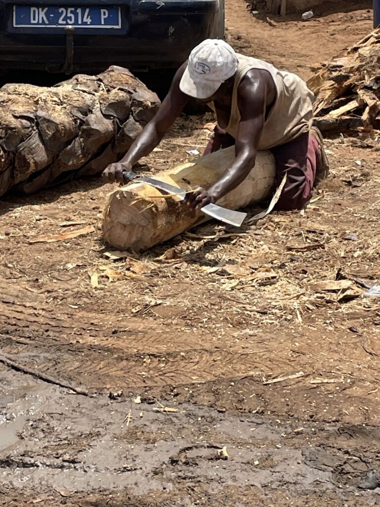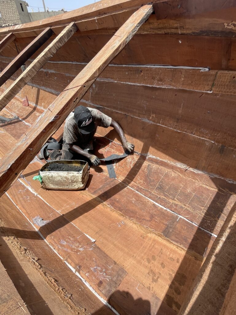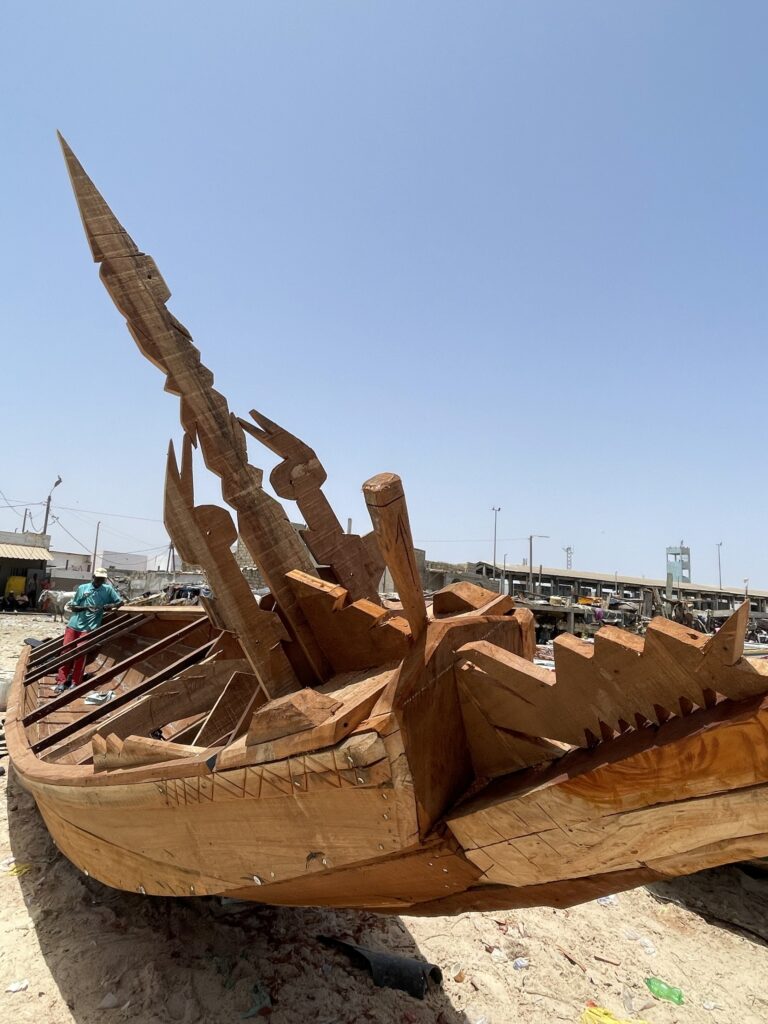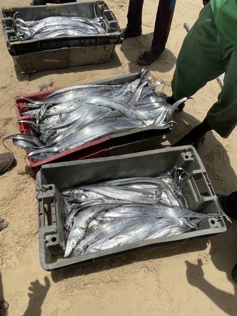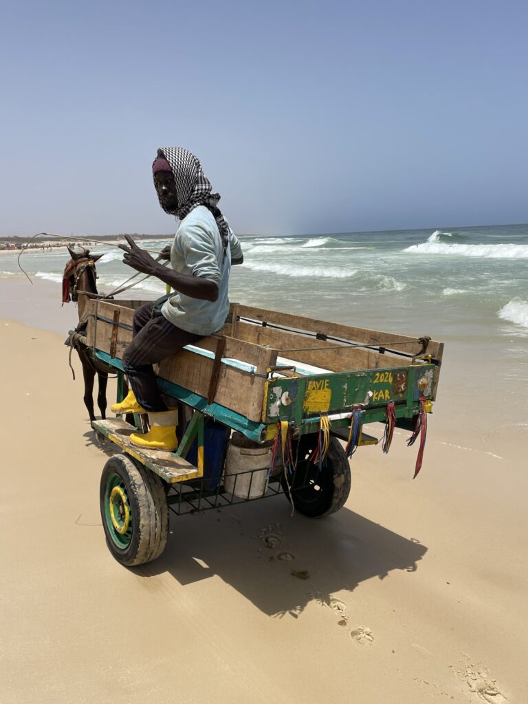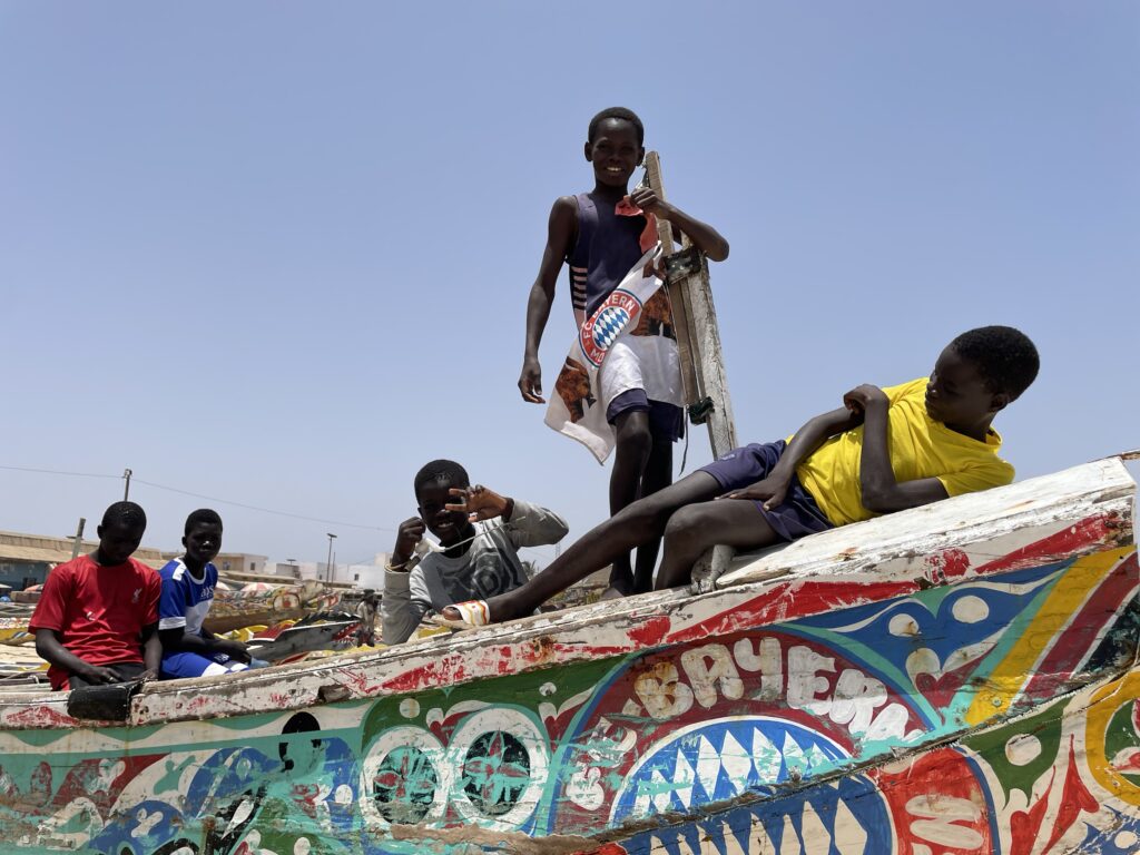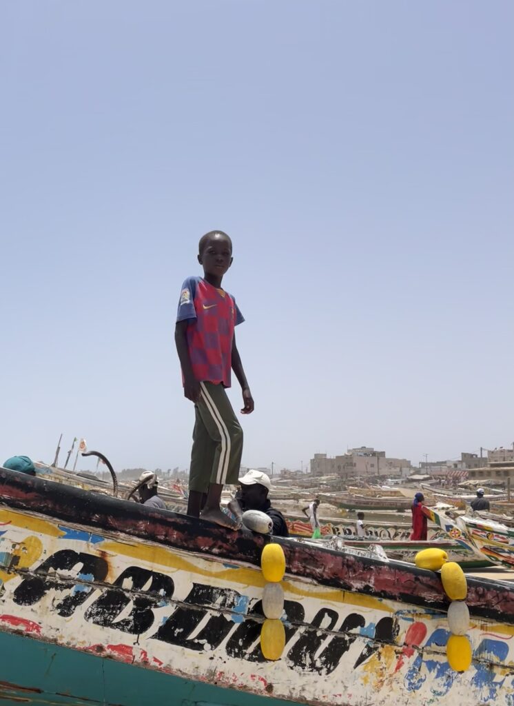 Su una bella spiaggia su cui si infrangono regolari le onde oceaniche creando creste bianche, ci sono letteralmente migliaia di barche, sulla spiaggia ed in mare, cani, carretti a cavallo, bambini che giocano, donne, migliaia di pescatori , casse di pesce fresco, mucchi di pesce che sembra avariato, distese di pesce fresco argenteo sulla sabbia , barche in costruzione, venditori, compratori, montagne di reti ammucchiate, donne che allattano, che squartano ed eviscerano pesci, un inferno che, ci dicono , si ripete ogni giorno per tutta la stagione di pesca. I pescatori , spesso in 20 o 30 su una barca relativamente piccola partono la sera e tornano al mattino tardo, a scaricare qui il pescato, ed a rimettere le barche, coloratissime a secco trascinandole sulla sabbia. I colori sono quelli del Senegal, più il bianco e l azzurro