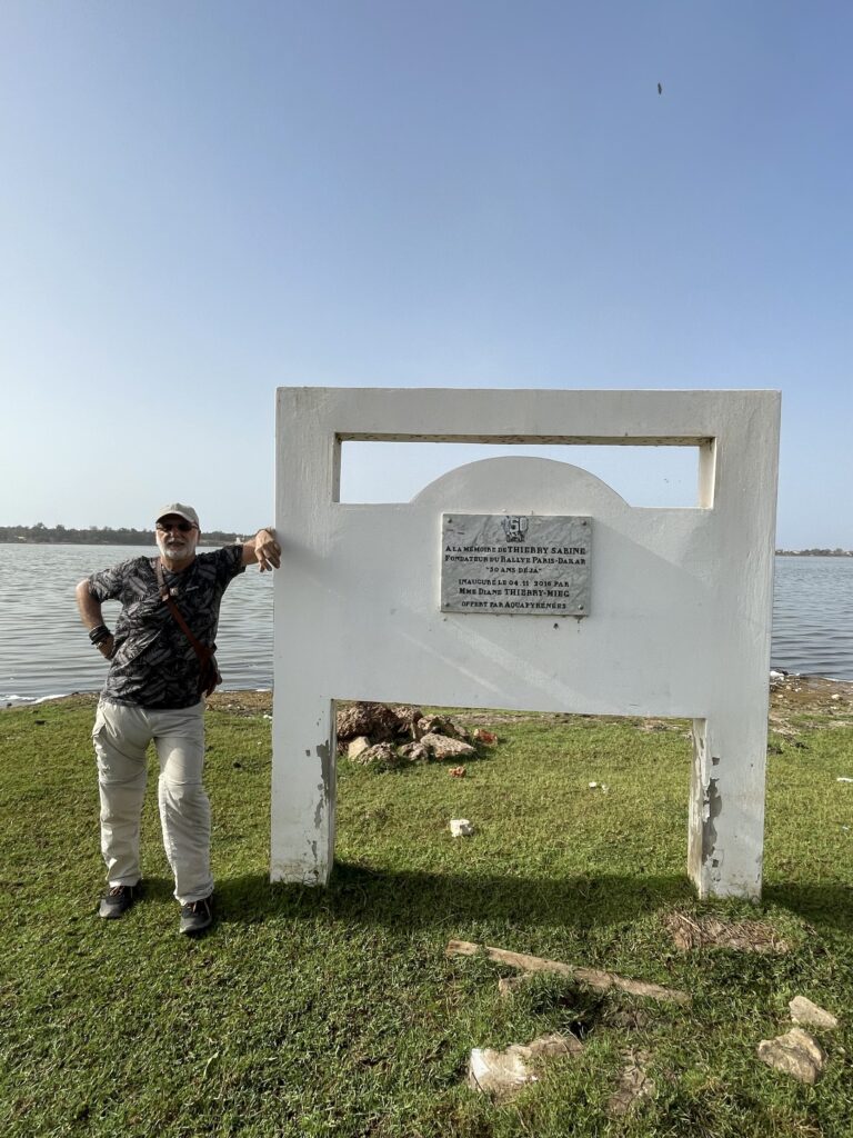 Arriviamo al Lac Rosee verso le due del pomeriggio e ci accampiamo nella piscina dell Hotel Salim, non ha stanze perché tutto pieno ma ci sono le docce per lavarci e cambiarci prima di partire stasera . Nel tardo pomeriggio Bernard ci porta nello spiazzo dove finiva la leggendaria Parigi /Dakar, fronte lago.