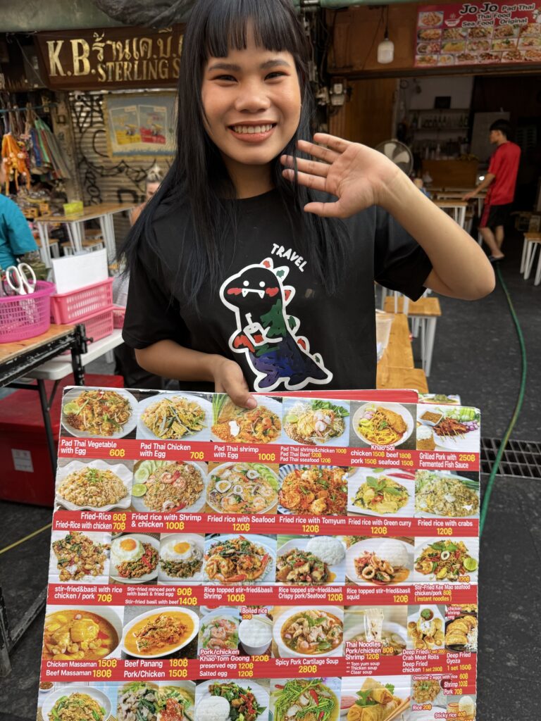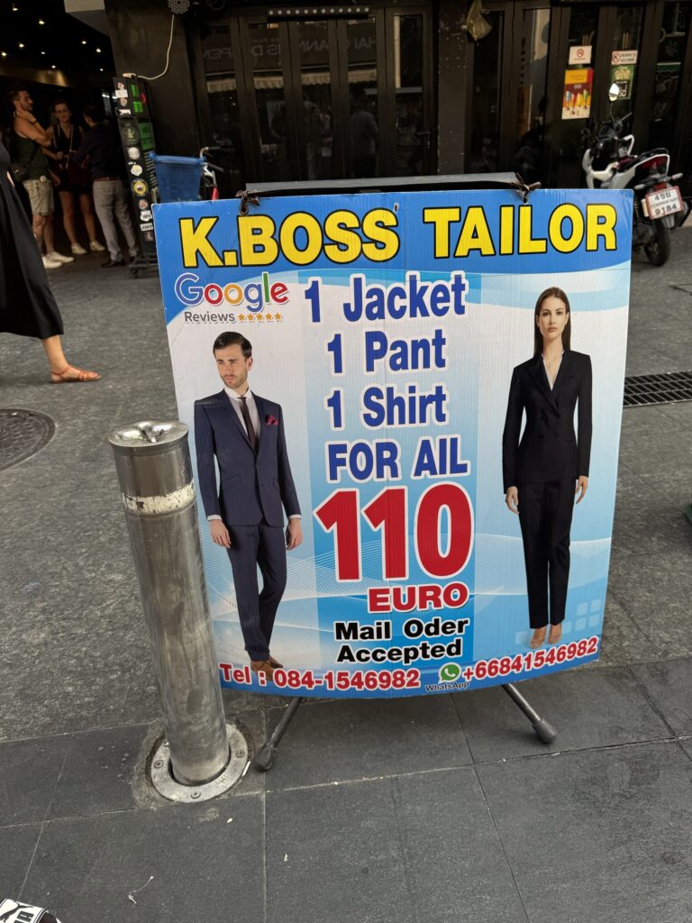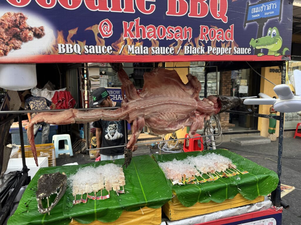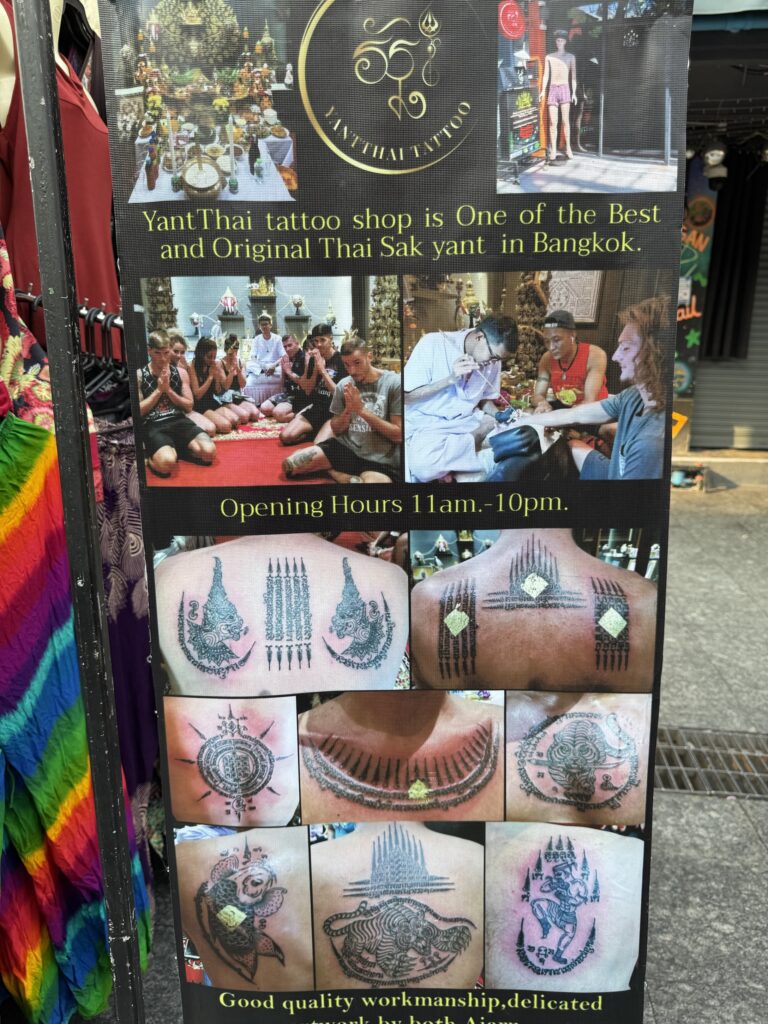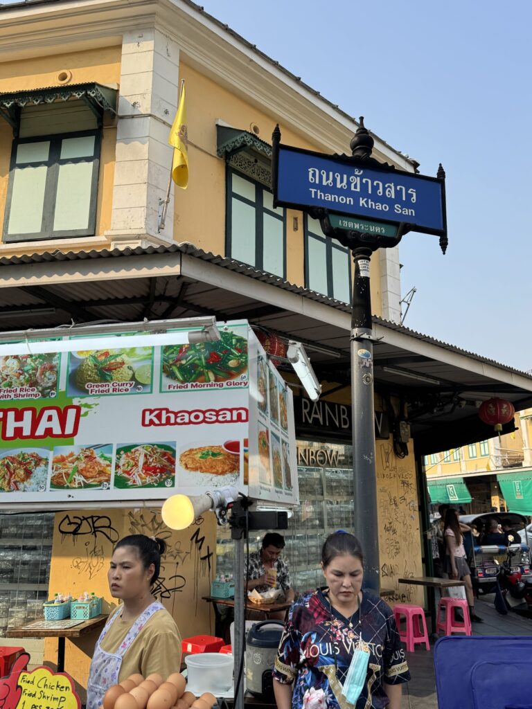 Quindi la giornata parte praticamente dalle 14,30…e mi devo ricredere. GoogleMap è fondamentale! Impossibile girarci senza oramai, trova percorsi, mezzi pubblici, orari, traffico e molto altro. Ci vorrebbe una cartina come lenzuolo ed un librone per avere le stesse informazioni…metro, piedi ,bus con rotta Khao San Road, la storica stradina di 300m nella Bkk vecchia degli hippy e backpackers anni 60, con negozietti bancherelle baretti alberghetti economici tatuaggi, massaggi. È chiamata Party Road ora, ed è una zona vivace, dove ci si può fare uno spiedino di alligatore, o bocconcini di insetti croccanti, o comperare le mutandine del vostro campione di Muay Thai (boxe) preferito, o farvi le treccine ecc. io mi faccio fare la cover per passaporto personalizzato Maucer🤪ovviamente.