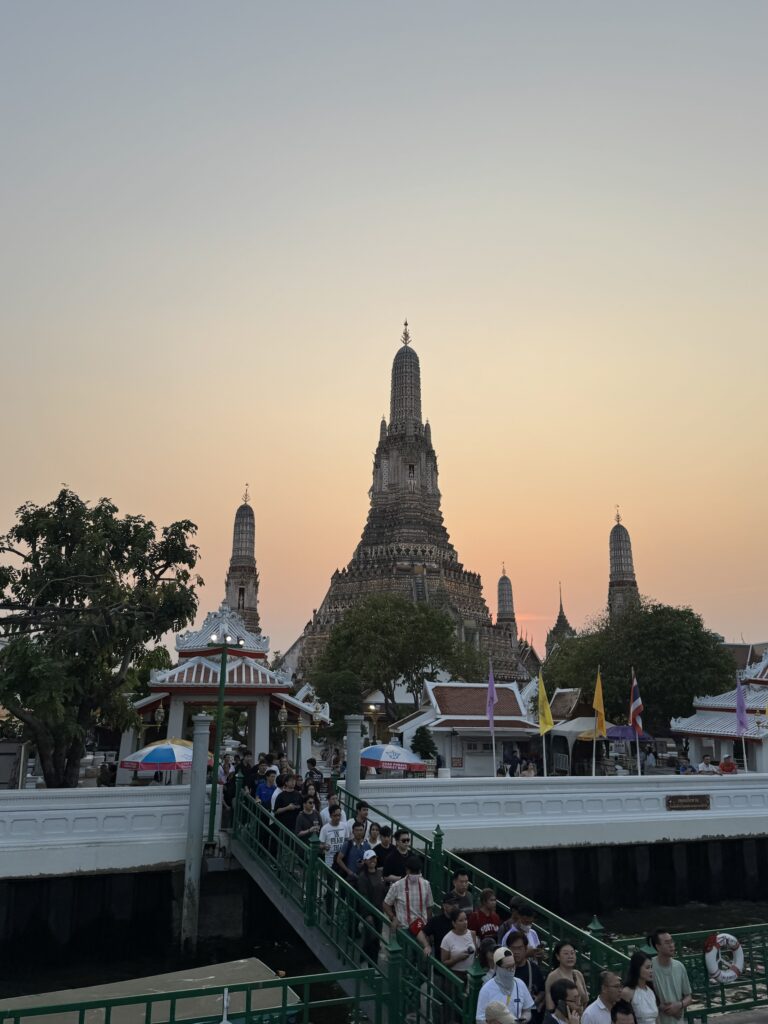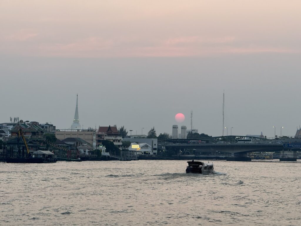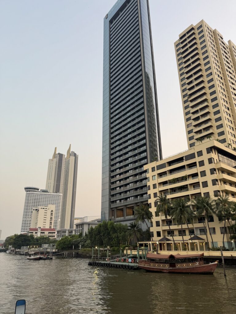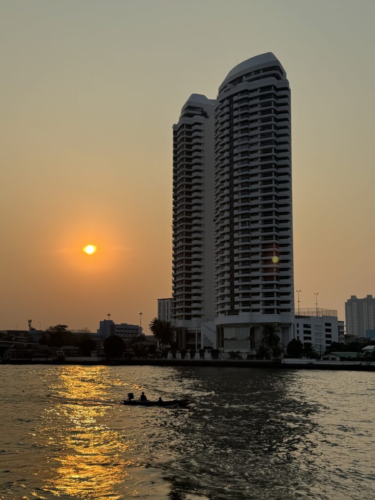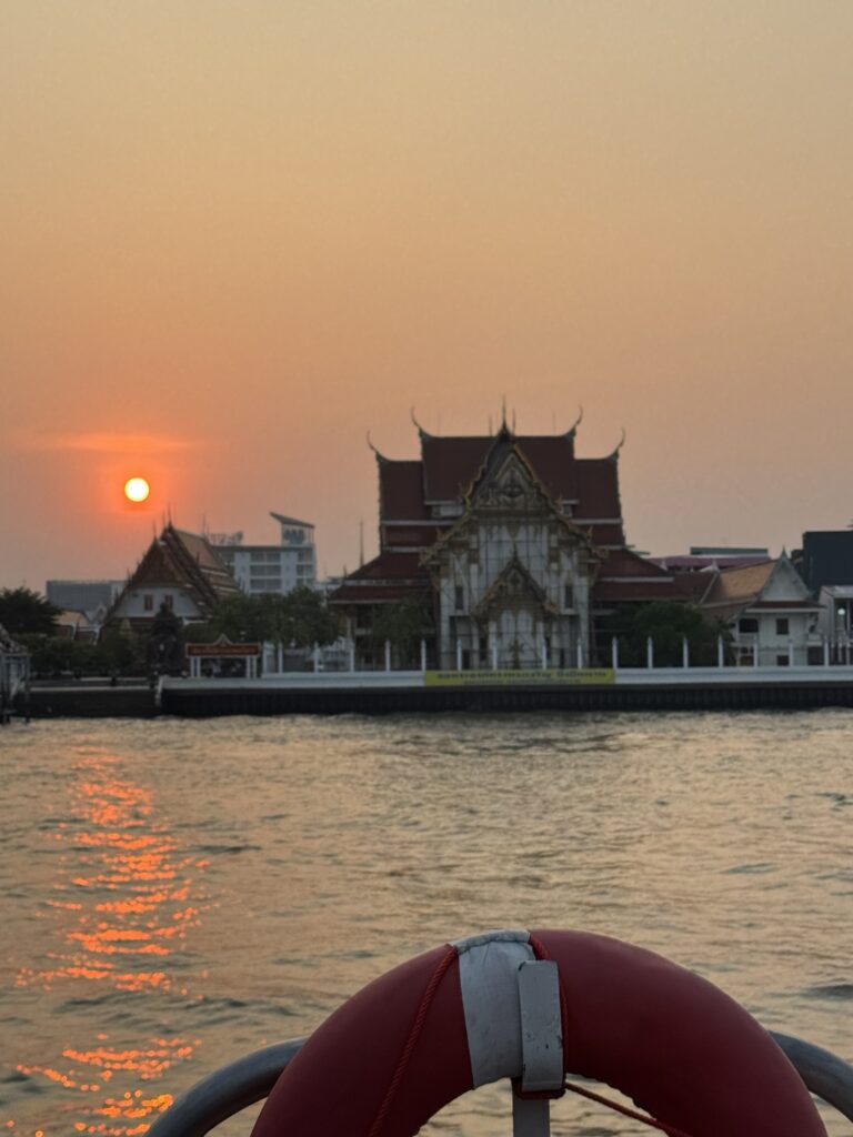 Mi addentro nelle stradine della Bkk vecchia fino a raggiungere a piedi il fiume Chao Phraya, quelle che una volta erano piste per elefanti ed ora negozi, alberghi, grattacieli fantascientifici e simpatici baretti per turisti affaticati. Non sono interessato a visitare il palazzo reale ed i magnifici ed elaborati templi dorati, od il Budda dormiente, almeno non ora, già visti varie volte. in questa interessantissima zona. GoogleMap mi suggerisce di prende un traghetto turistico per 1,5 euri , molto popolare, che mi risparmia chilometri di camminate. E la navigazione sul fiume tra grattacieli e templi al tramonto è spettacolare, una città magnifica, varia, bellissima. Viene chiamata anche la Venezia asiatica perché ha molti canali su cui ci sono anche mercati galleggianti.