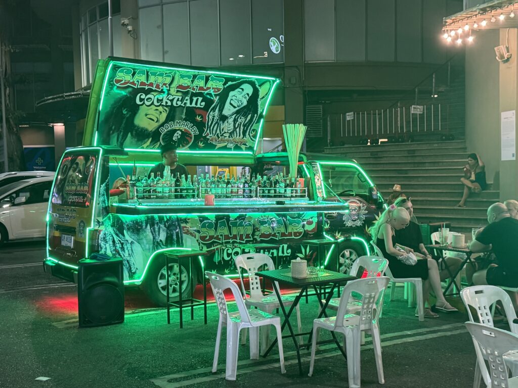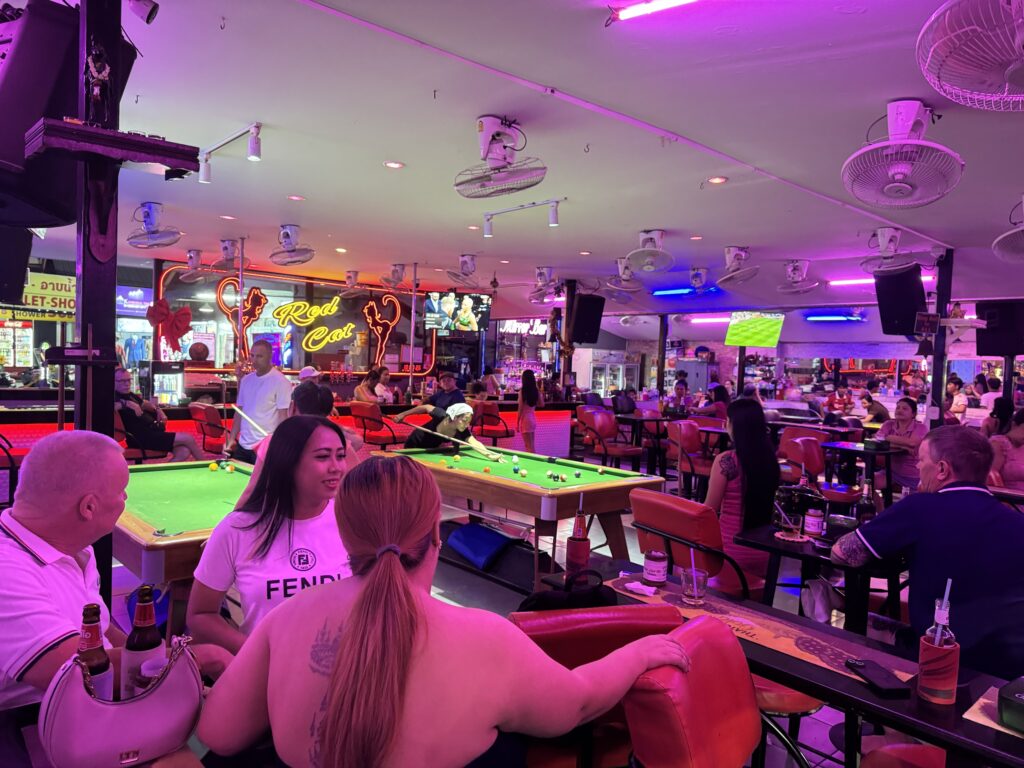 Stanco di passeggiare sotto le palme della Beach Road, mi fermo a caso in uno dei tanti beer-garden lungomare, il RedCat, questo un po’ decadente , ma mi piaceva il nome, con gli sgabelli che avranno visto probabilmente più di qualche culo americano in divisa ai tempi d’oro . Happy Hour, birra Chang gelida , a 85 bhat , a collo come si usa qui.
