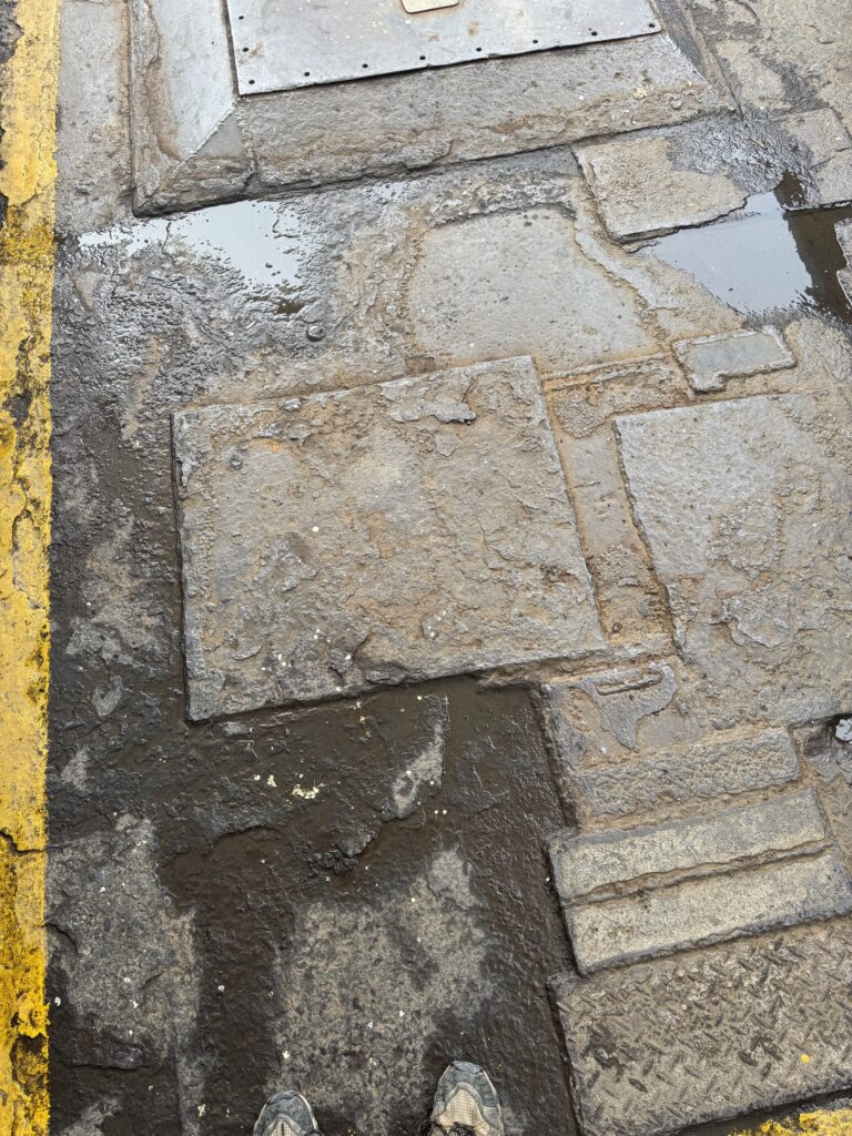 Sul traghetto , da vecchio ingegnere navale scampato al pericolo, resto ancora affascinato dalle lamiere del ponte, quasi tenute assieme dalla ruggine, sembrano un moderno quadro astratto. L’ acciaio è un bel materiale, mi ha dato da vivere!