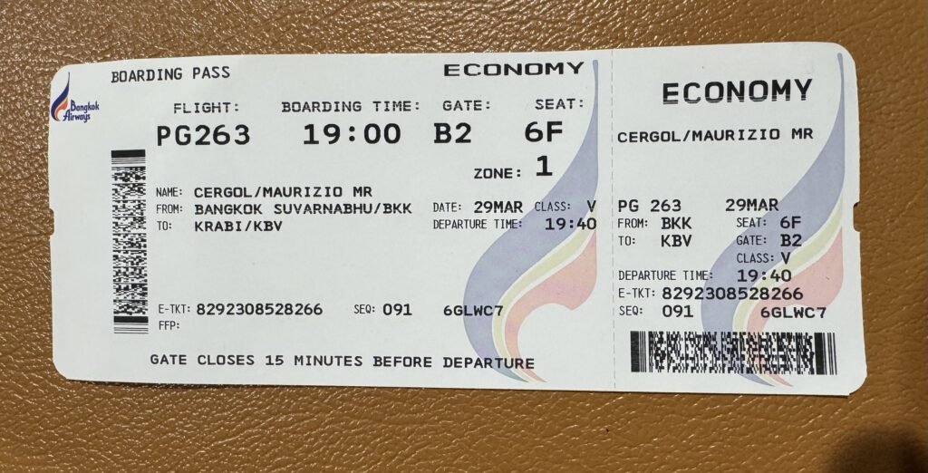 Quindi, quickly 😉 rintraccio al sesto piano dell impressionante hall , l’ unica biglietteria , quella della Bangkok Airway e con una generosa strisciata da ben 67 euro , da ricco pensionato che non bada a spese, e non più da backpackers duro e puro, sono sull unico volo con posti liberi, quello delle 19.30, a tariffa alta ma regolare, giusto in tempo per arrivare fino al gate e per il controllo di sicurezza.