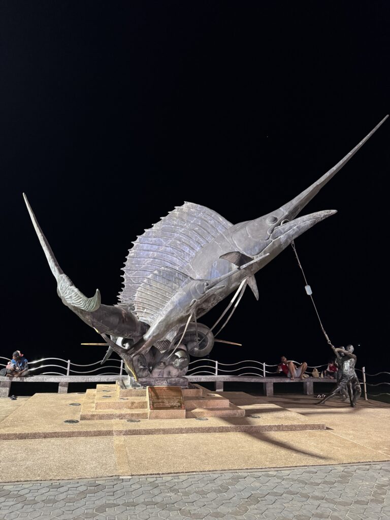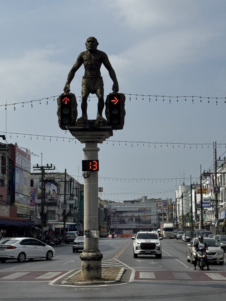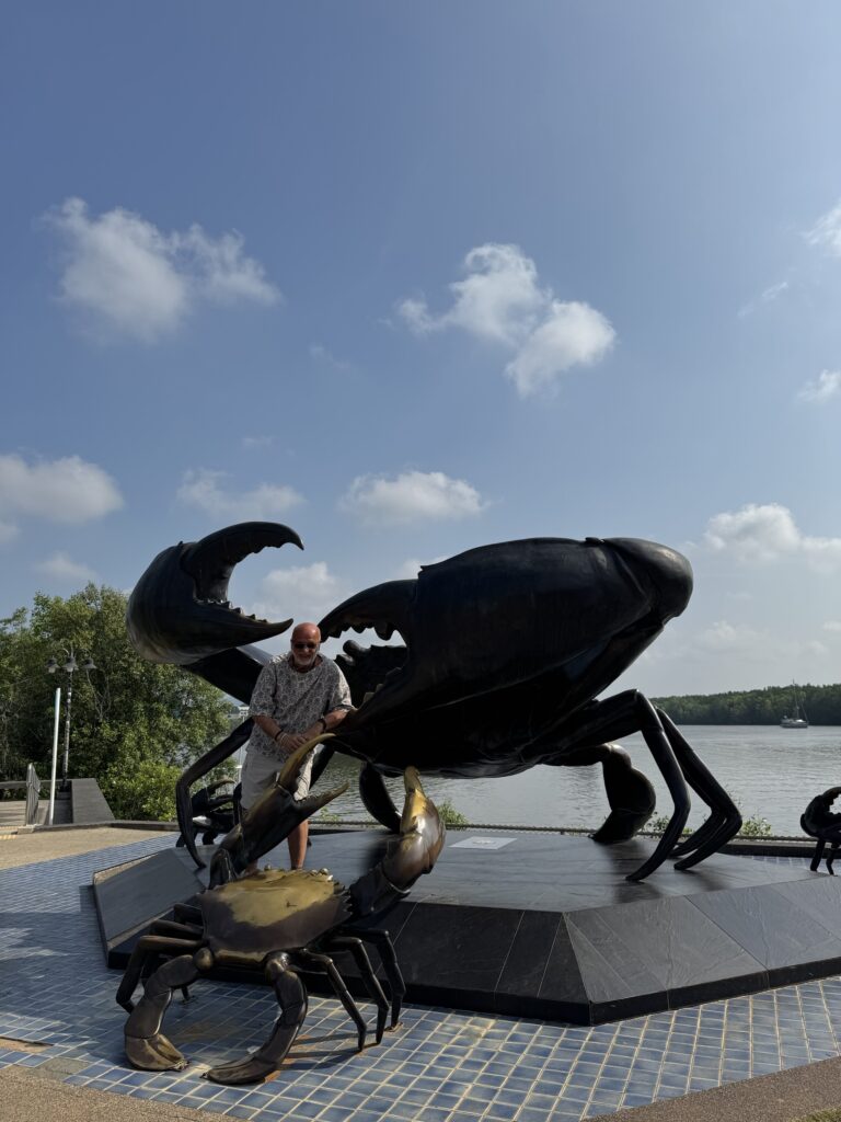 Al mattino scopro che Krabi Town è una cittadina sonnolenta, in riva ad un fiume. Sarà perché domenica, ma mi sembra di scarso interesse turistico . Faccio un giretto in mototaxi per esplorare e scopro due cose, che il simbolo di Krabi è il granchio (Crab in inglese…), creatura fondamentale per il bio equilibrio delle foreste di mangrovie, bellissima la scultura bronzea con lo sfondo del fiume ed i roccioni caratteristici di qui, coperti di vegetazione .