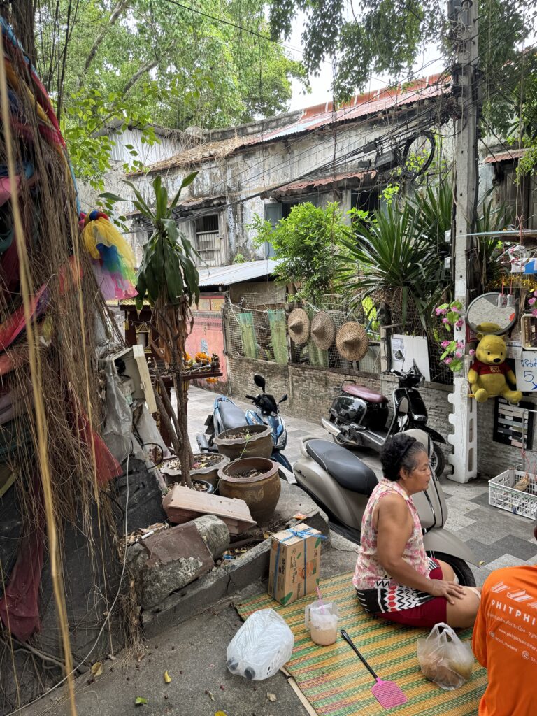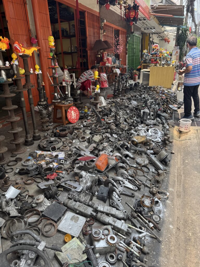 Oggi voglio una Bkk diversa, particolare, non turistica, voglio fare un ultimo giro di giostra a modo mio, off the beaten track…Per cui soliti 40 min di metro ( il minimo qui per andare da qualche parte) e poi lunga camminata addentrandomi a piedi a 33 gradi e 100% di umidità nei vicoletti a sud di Chinatown, lungo il fiume. La zona si chiama Talat Noi, una zona povera rimasta come 50 anni fa, casette fatiscenti , negozi di rigattieri, ferrivecchi, meccanici che riciclano tonnellate di pezzi vari di motori .Mercatini rionali e zero turisti farang, ne avrò incontrati 2 o 3 in tutta la mattinata.