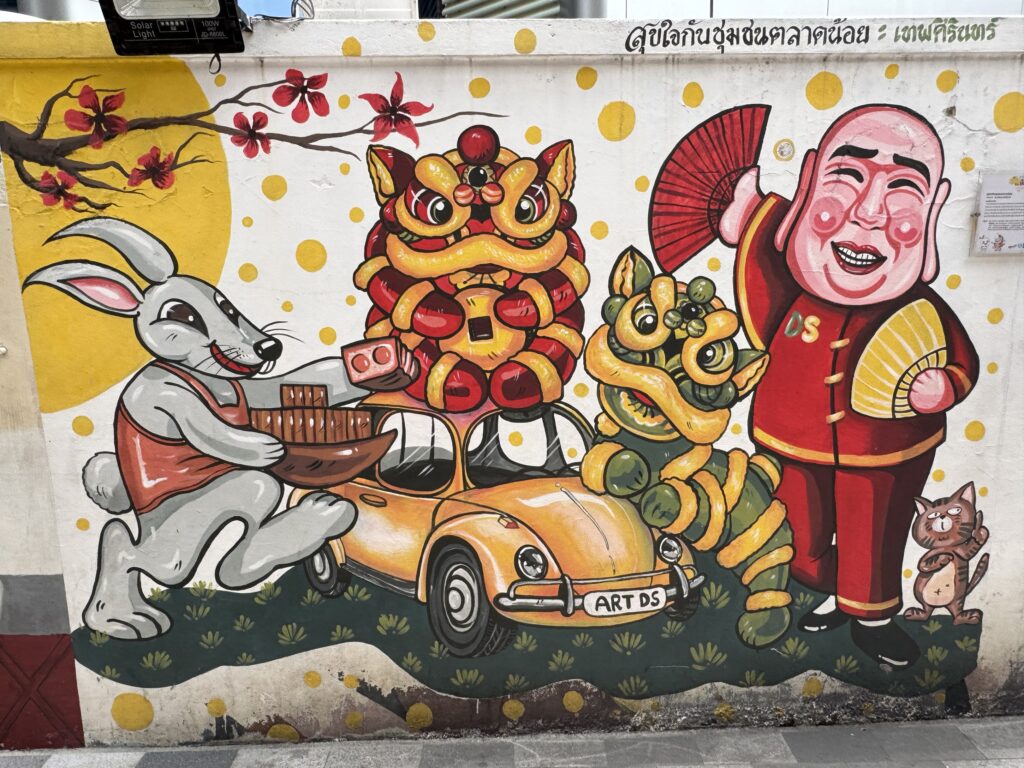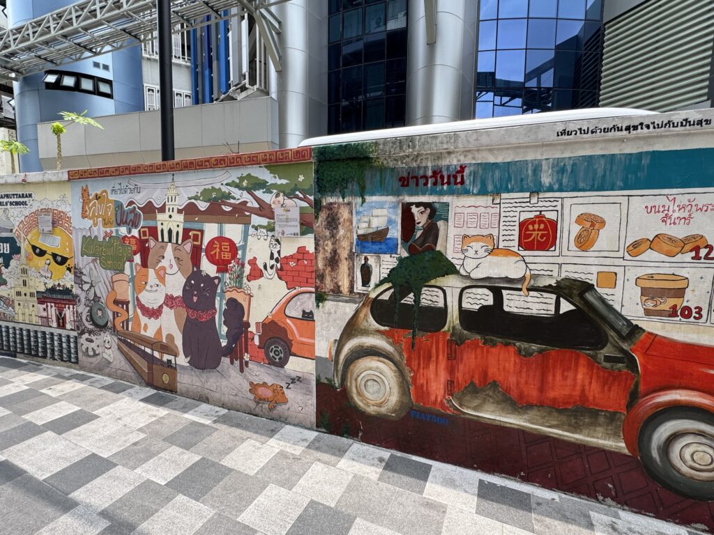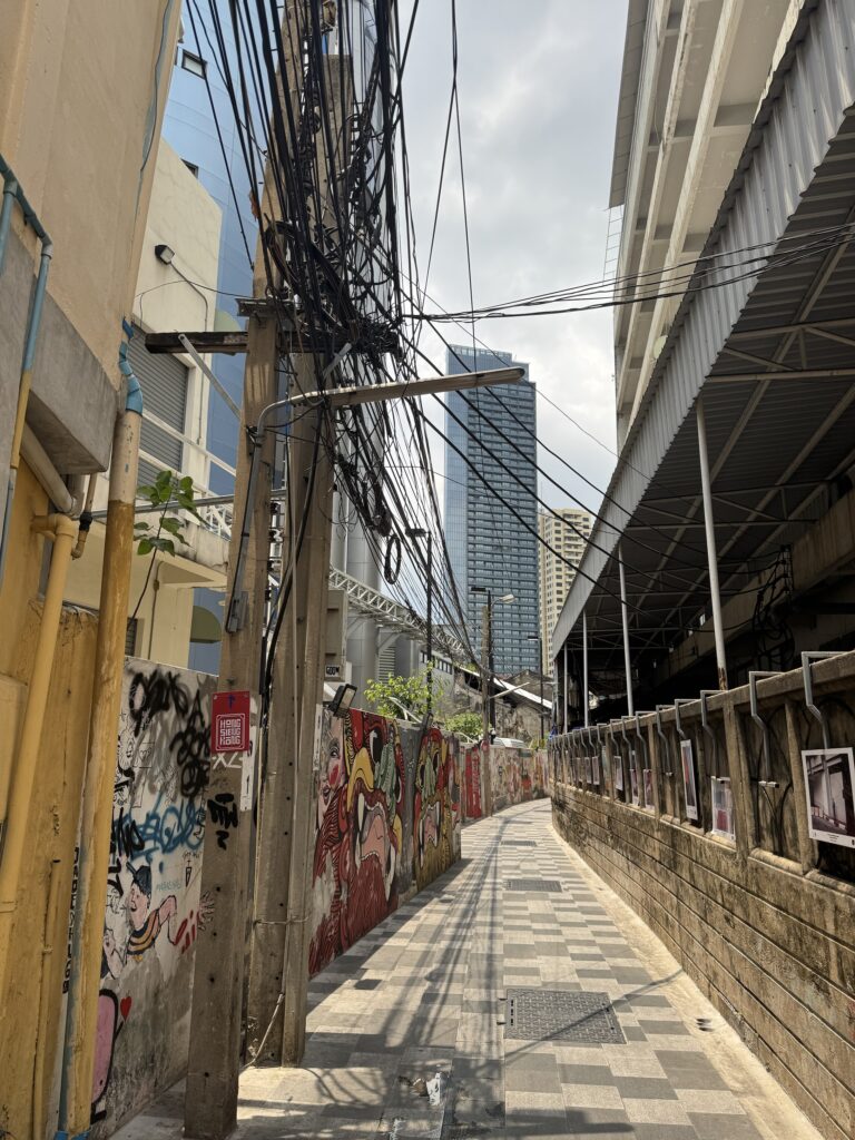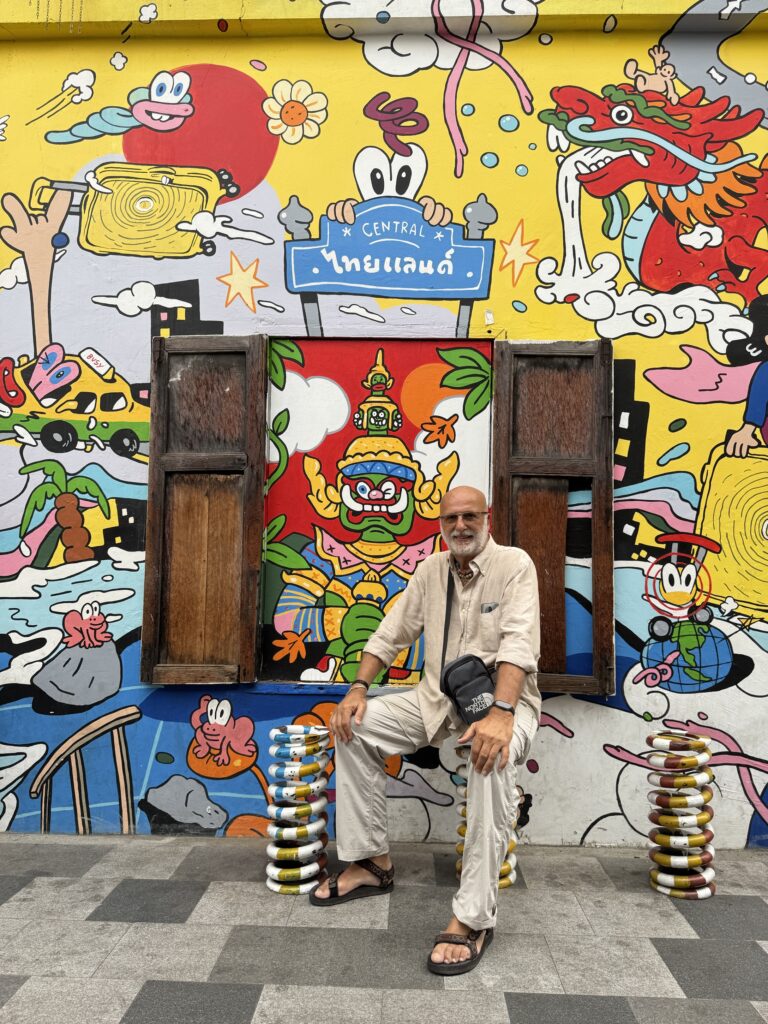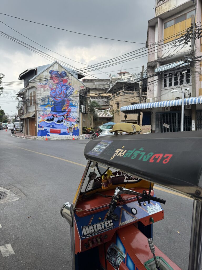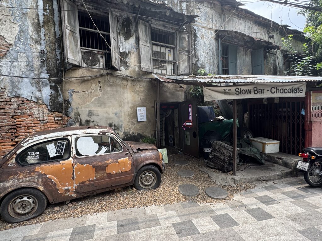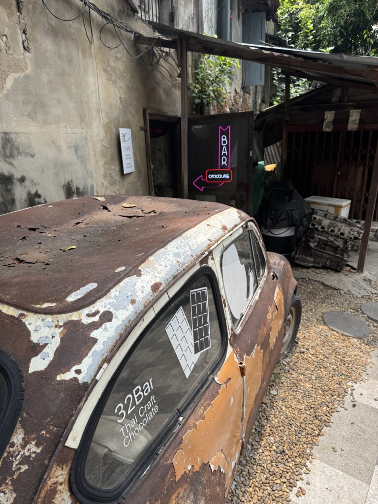 So che c’è una stradina che alcuni artisti hanno decorato con vari murales, per valorizzare un po’ la zona, assolutamente degradata ma integra, quindi affascinante nel contrasto con i ricchi malls, e so di un decadente choco-bar dietro l unica , arrugginita, Fiat seicento di Bkk. Una bellissima caccia al tesoro per me, mi diverto a cercare le chicche strane…