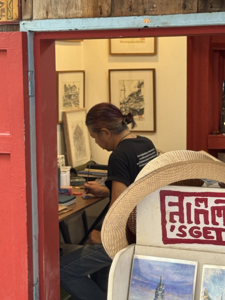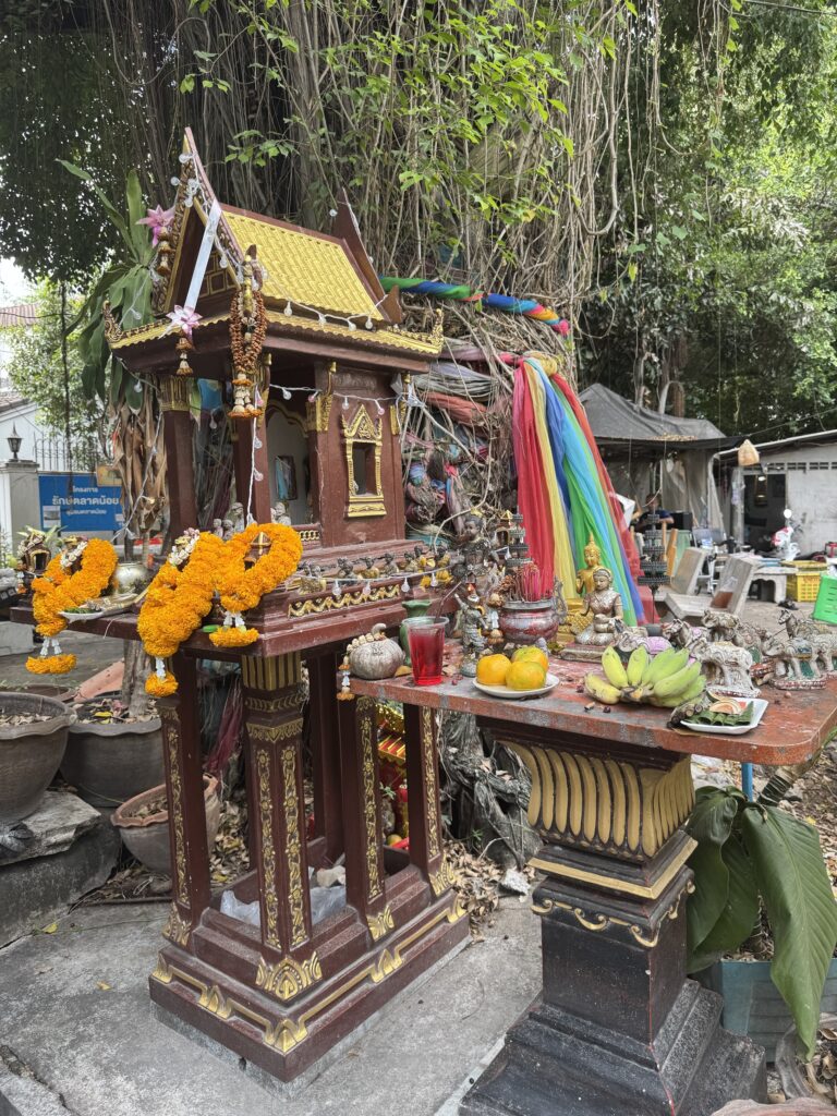 E sono ripagato da scene di vita vera, vecchietti che chiacchierano in strada, alberi sacri e tempietti, giardinetti, negozietti strani , vecchie cose della vecchia Bangkok. Il caldo è atroce, sudo come un cammello, cammino molto ma sono contento di esser qui. E la vecchia Fiat seicento c’è ancora!