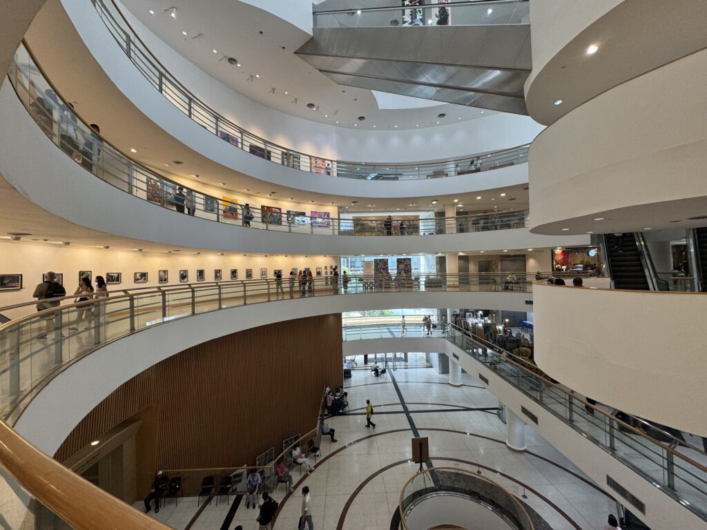 Torno a Silom in mototaxi, sono distrutto e disidratato, per cui l unica è rifugiarsi in un mall, bere ed asciugarsi all aria condizionata. Mi riprendo un po’ e Mi spingo con due fermate di metro a Siam Center, ma prima di entrare all MBK per gli ultimi acquisti, oramai lo conosco come le mie tasche, visito il Thai Cultural Center un bel edificio architettonico di fronte, il cui interno ricorda un po’ il Guggenheim a NewYork . Anche qui pochi turisti, solo thai acculturati…Ci sono mostre ed esposizioni, alcune decisamente strane e discutibili, e scopro pure probabilmente l unico negozio di Bkk che vende buon materiale per acquarello, di produzione giapponese e coreana, ma anche noti marchi europei, qui carissimi! oggi è la giornata delle chicche introvabili, ma non compro niente, sono a tappo…
