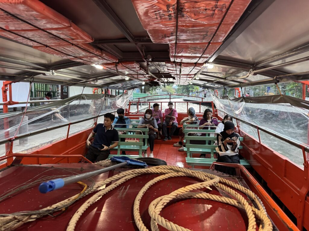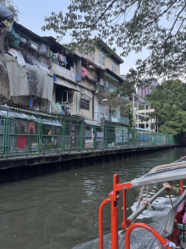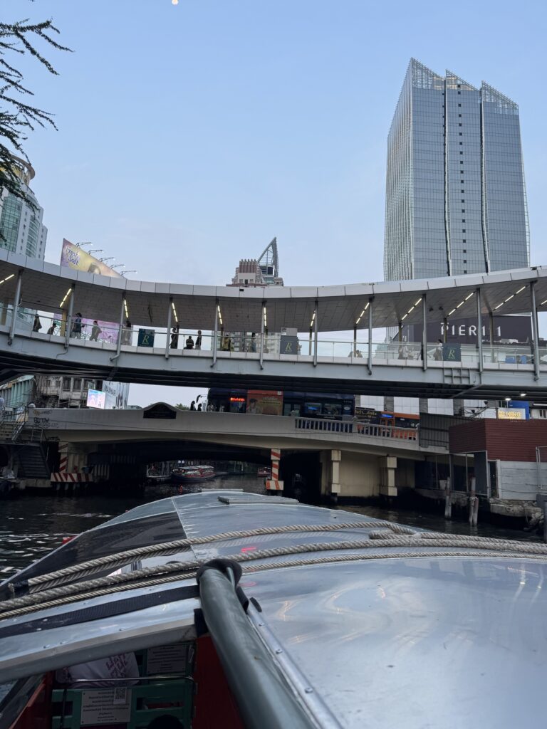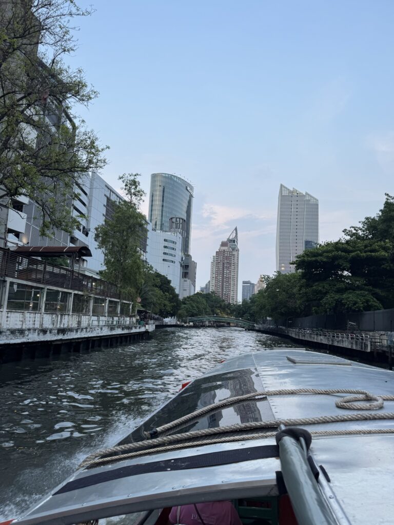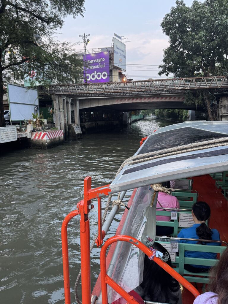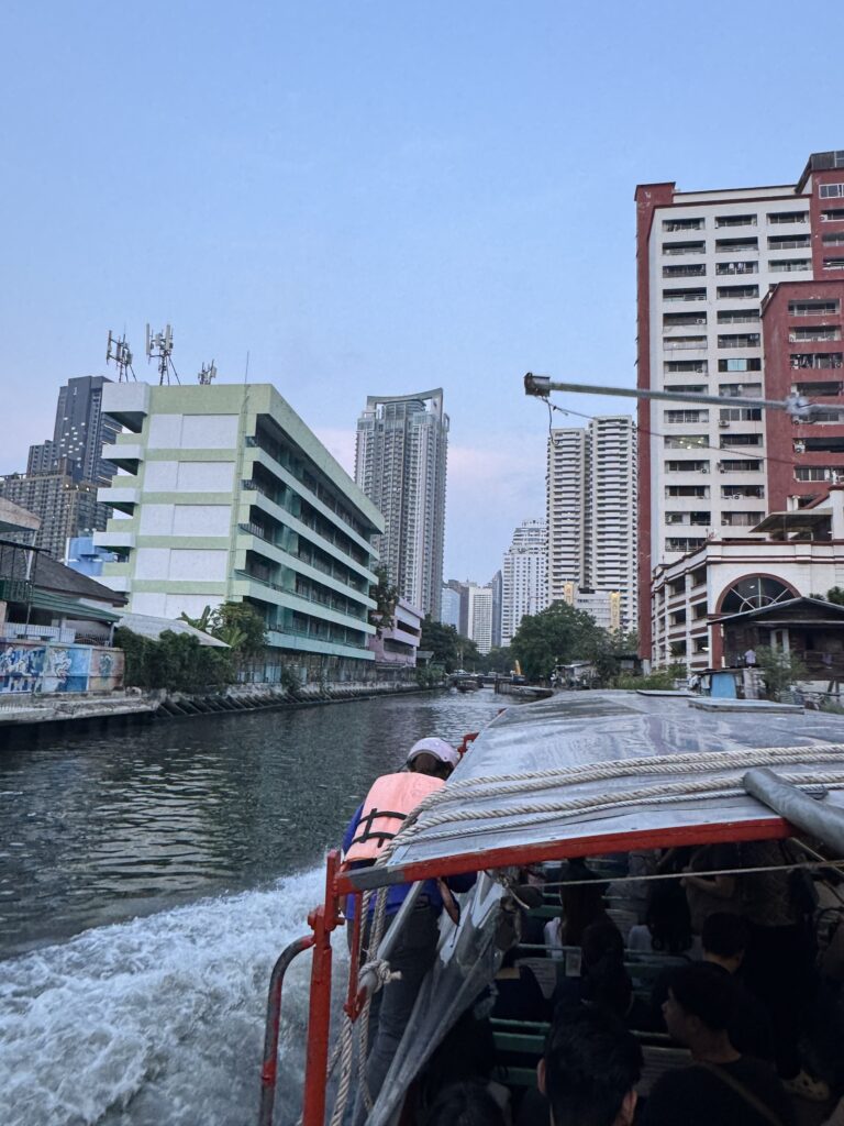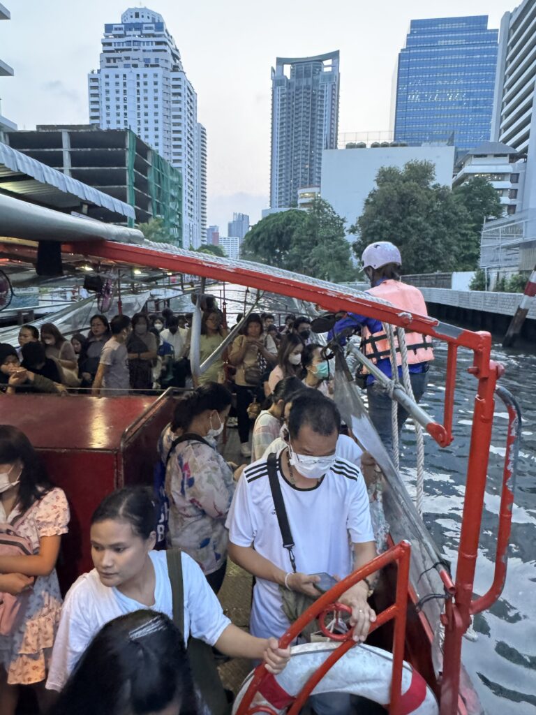Penso alla rotta di ritorno in hotel e senza usare per l ennesima volta lo skytrain e poi cambiare o camminare o mototaxi , mi sono ricordato di aver letto che in certi canali di Bkk usano ancora vaporetti come a Venezia ma più veloci. Un po’ di web, un po’ di googlemap ed un po’ di gambe mi portano sotto un ponte dietro gli enormi Mall dove c’è un imbarcadero nascosto . Unico turista occidentale, è un mezzo di trasporto piacevole veloce economico (0.40 euro) usato solo dai locali, spesso per tornare a casa dal lavoro. Non è tanto conosciuto dai turisti, esperienza bellissima, scorci dei grattacieli di Bkk unici , e sbarco praticamente a 5 min dal mio residence! Il canale è stretto, vanno veloci e quando si incrociano provocano onde altissime. Divertente!