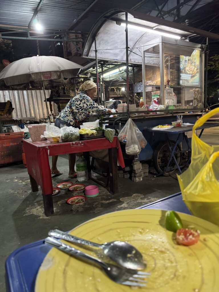 Ceno con una coscia di pollo e del riso fritto, in un postaccio all incrocio di un traffico impressionante, sopra il ponte sul canale, dove sono sbarcato, oramai i bhat sono contati…, ho cambiato il grosso che mi rimaneva. Per la cena faccio affidamento ai miei anticorpi oramai rafforzati da anni di viaggi. 🤞