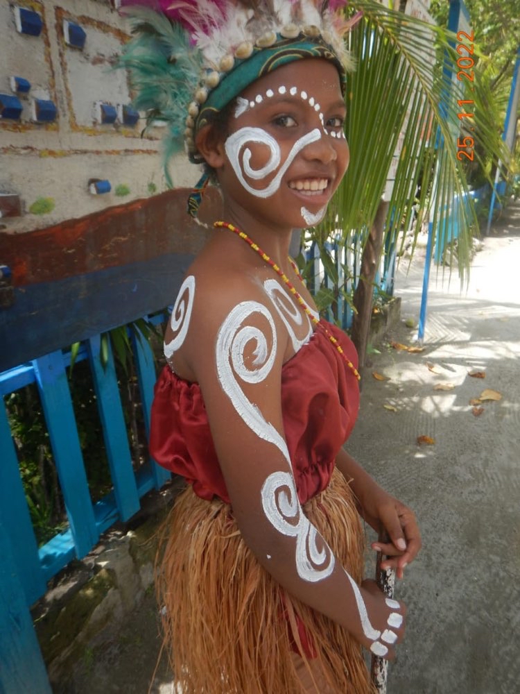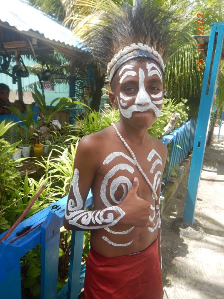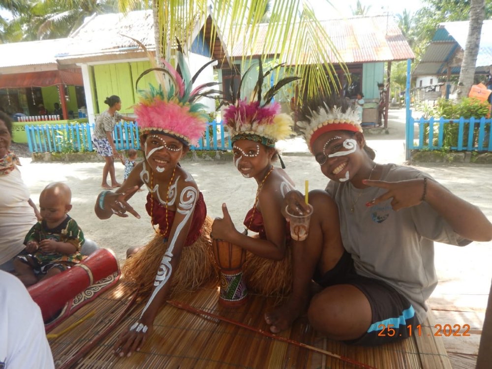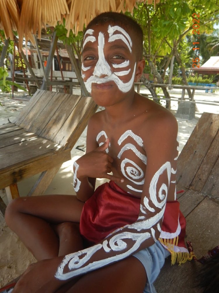 Al ritorno, snorkel nel jetty, poi pranzetto con riso e baby-tuna pescato ieri, e giretto per il villaggio ove L orchestra locale ed i bimbi, travestiti da selvaggi di Papua, improvvisano danze tribali per la 15ina di turisti (sostanzialmente vecchi americani) che sbarcano da un veliero da crociera ormeggiato qui di fronte.
