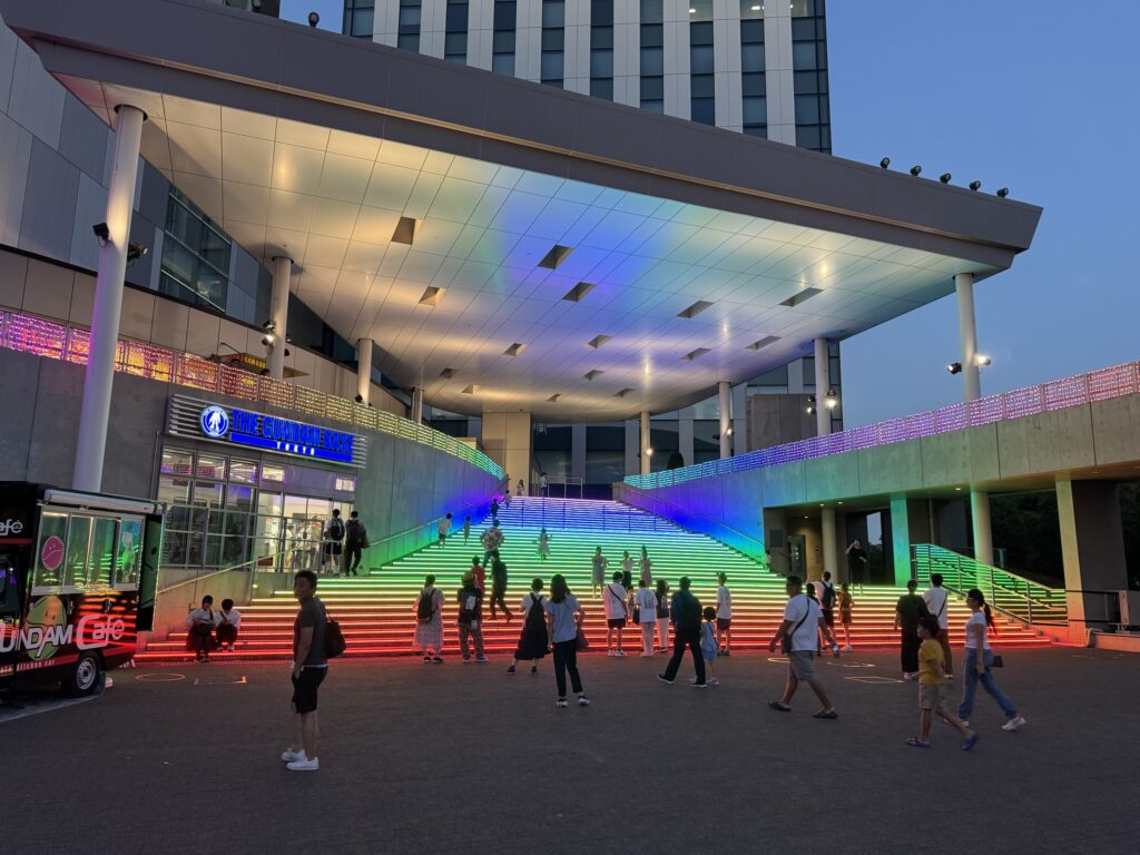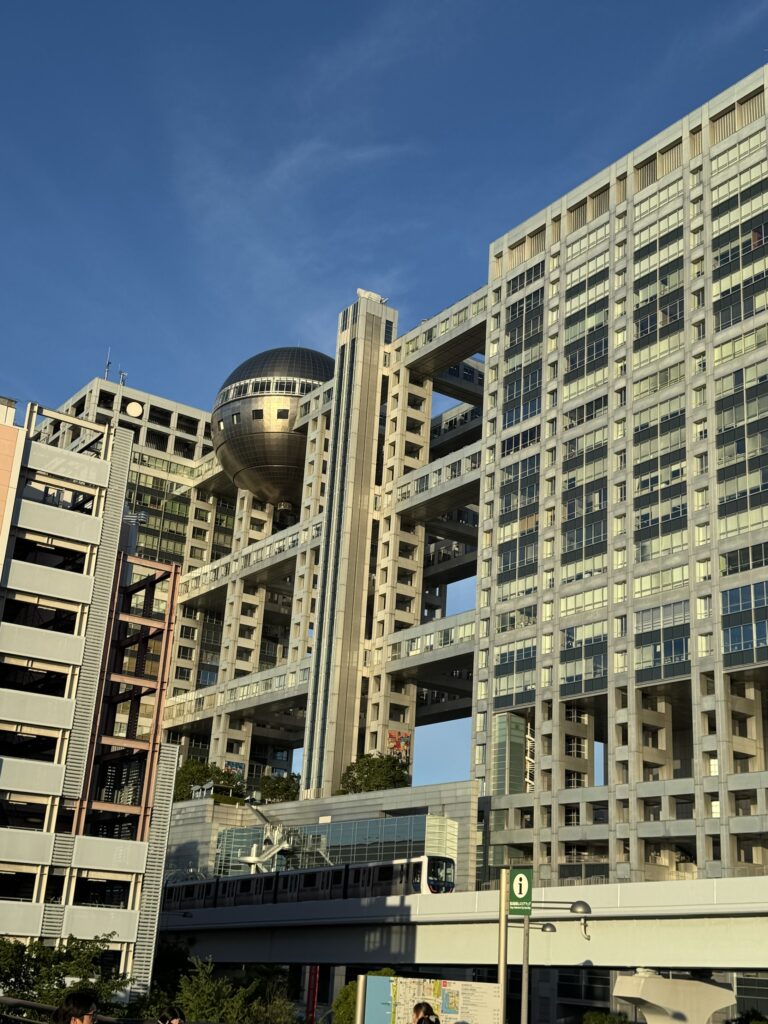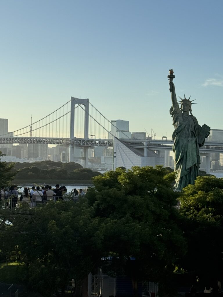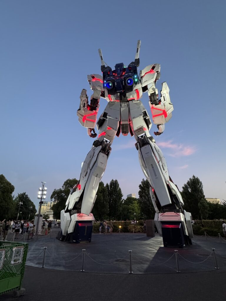Riparto per un altro giro di stazioni incubo , ed il livello di videogioco si complica , con la rete nel caos causa un incendio in un treno della Yamanote Line e milioni di persone ferme stipate… comunque altre linee funzionano e riesco a raggiungere con un trenino panoramico e completamente automatico Odaiba, una bella isola giardino nel porto di Tokyo, attraversando il famoso Rainbow bridge. Qui tutto è molto dilatato e curato ed oltre lo strano edificio della TV c’è pure la riproduzione della statua della libertà e un enorme Mazinga che pure si muove, impressionante.