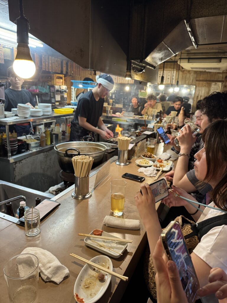 Porto il gruppo attraverso la Omoide Yokocho (stradina dei ricordi) sotto le rotaie del treno, un vicoletto sporco ed affumicato , denso di banchetti anche da soli 3 o 4 posti dove ti cucinano piatti tipici di fronte , affumicandoti tutto, ultimo rimasuglio della vecchia Tokyo che fu, dove i pendolari mangiavano prima di tornare a casa. E al Golden Gai, una serie di vicoletti stretti con centinaia di minuscoli micro-bars con banconi anche per solo 2 o 3 clienti , che così fanno amicizia con il barman e tra di loro , ubriacandosi allegramente in compagnia. O le strade con i saloni di pacinko , oggigiorno sostituiti con slot machine chiassose e scintillanti dove i giovanissimi, ma anche gli anziani, si rincoglioniscono per ore…