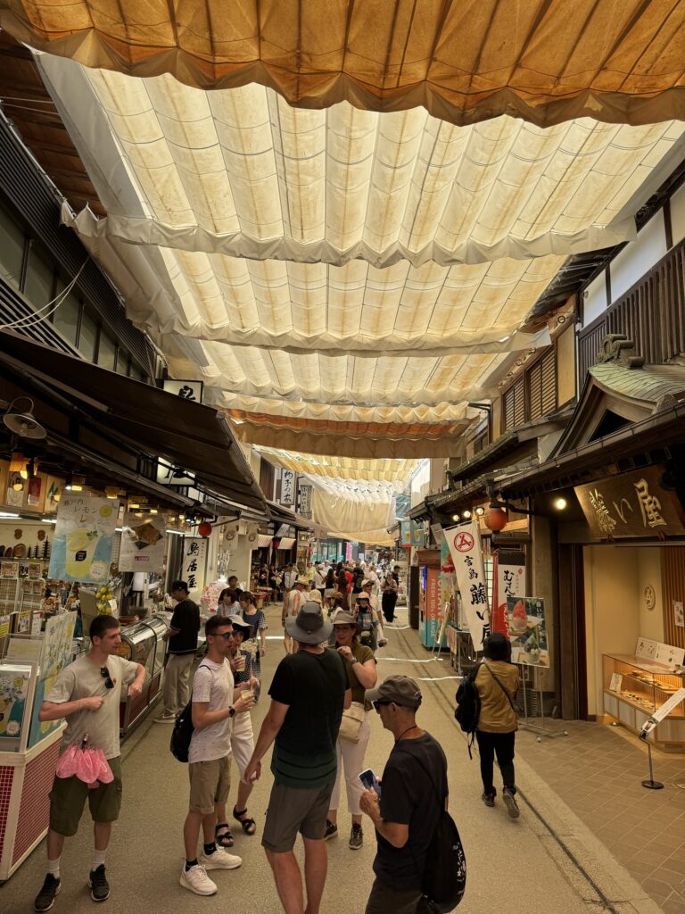 Il percorso per arrivare al particolare tempio sull acqua difronte al quale c’è il Torj, è una passeggiata lungomare alle spalle della quale c’è una viuzza di soli negozi, pasticcerie, assagerie di roba varia, ristoranti, sake-bar, souvenir ecc, vero trappolone per turisti, che qui vengono a migliaia ogni giorno.