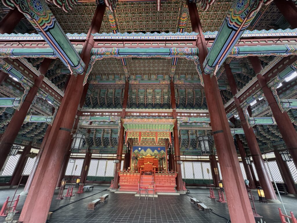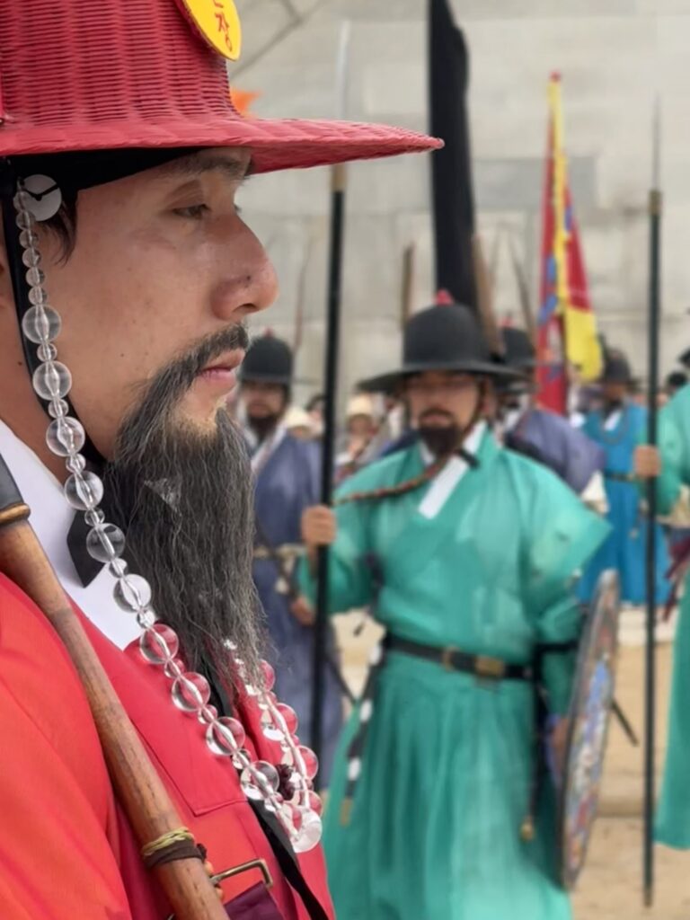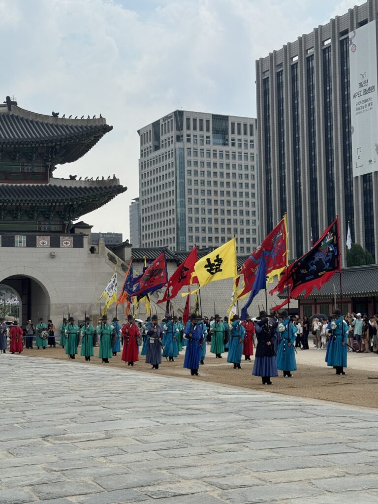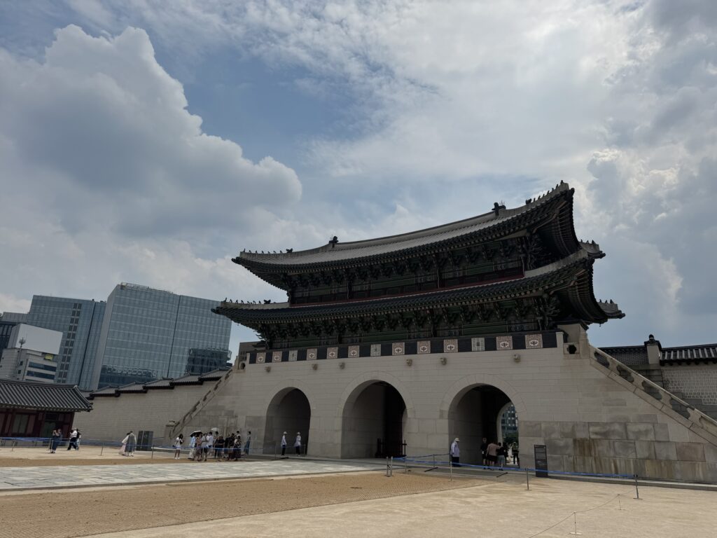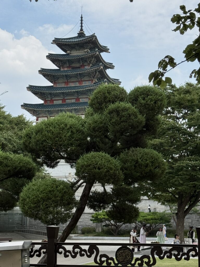 Con l’ennesima metro passiamo a vedere il Deokaungung, il palazzo reale , a fianco del municipio ( bel edificio in cristallo), il cambio della guardia alle 10 è saltato causa il troppo caldo (!) . Soddisfazione per l ingresso gratuito, almeno i 70anni servono a qualcosa…Scopro poi che il gruppo voleva vedere un altro palazzo ( ce ne sono 5 qui…) il Gyeonghuigung, quello più turistico e famoso. Con un bus quindi ci trasferiamo a nord. Google map non funziona benissimo, qui si deve usare NaverMap, ma avendo trovato una mappa su carta, con il mio vecchio mood analogico e non solo digitale, trovo meglio le direzioni e le rotte da fare.