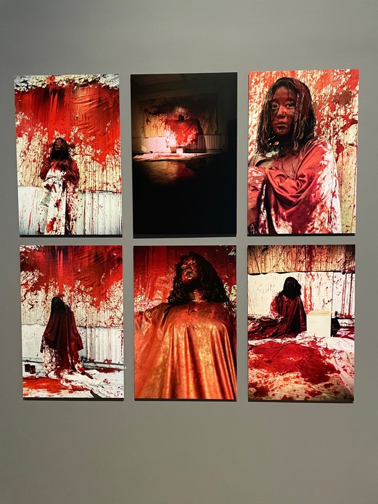 Ci sono suoi quadri, fotografie, altre installazioni decisamente inusuali, quale il pianoforte bruciato con il fumo che esce, o filmati in cui lei si copre di fango.