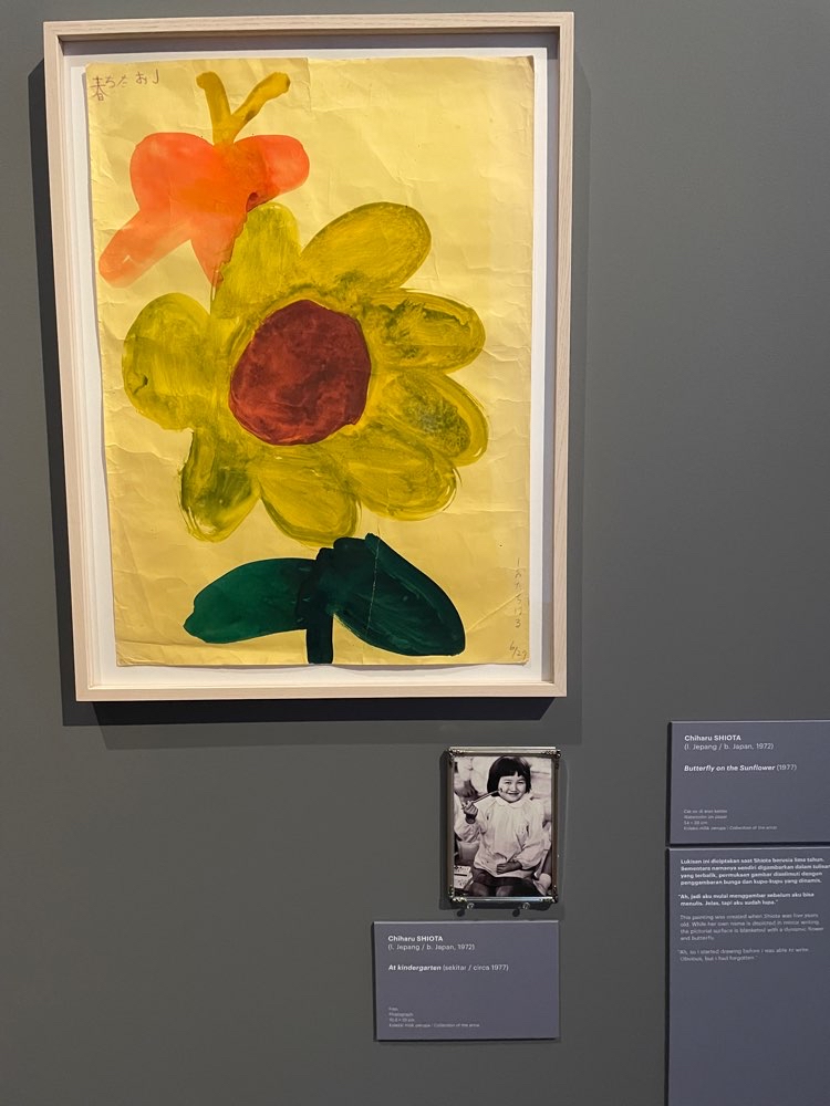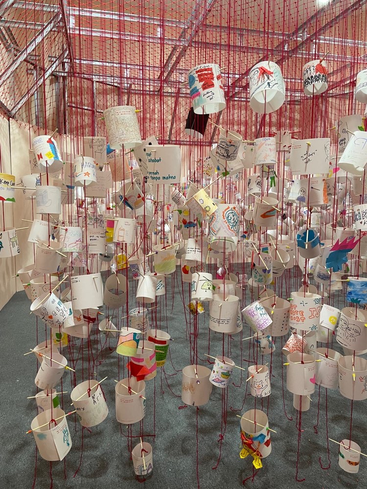 All ingresso della mostra, ai visitatori viene chiesto di fare un qualsiasi schizzo artistico su un foglietto, che poi viene appeso come un cilindro assieme agli altri, ed io, francamente non so perché, ho ritagliato una farfalla arancione…