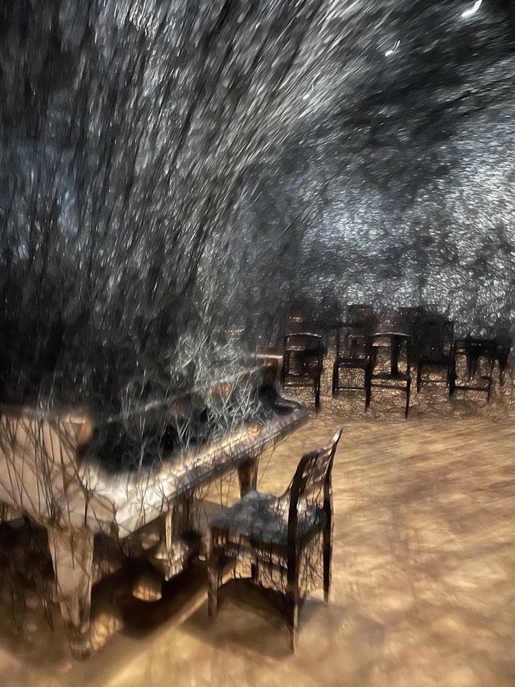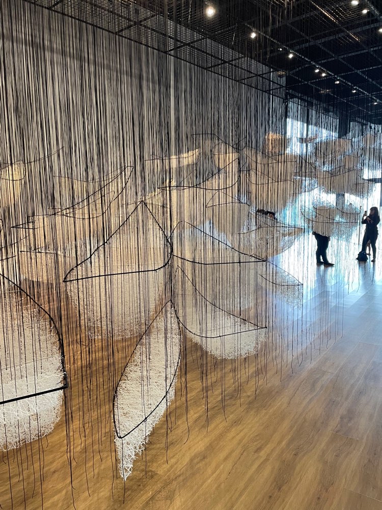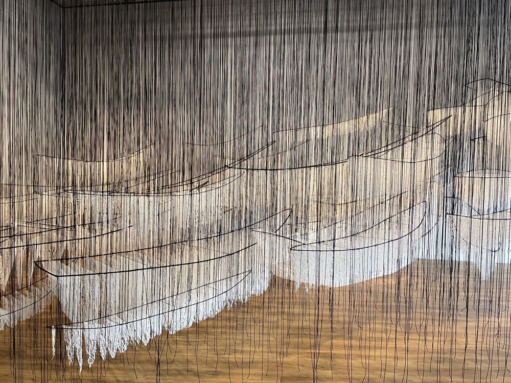Si tratta di una installazione decisamente affascinante, con delle barche stilizzate (…le Pinisi in costruzione che sono andato a vedere?) da cui come delle fiamme, si dipartono ragnatele di fili intrecciati a formare delle nuvole, o del fumo…