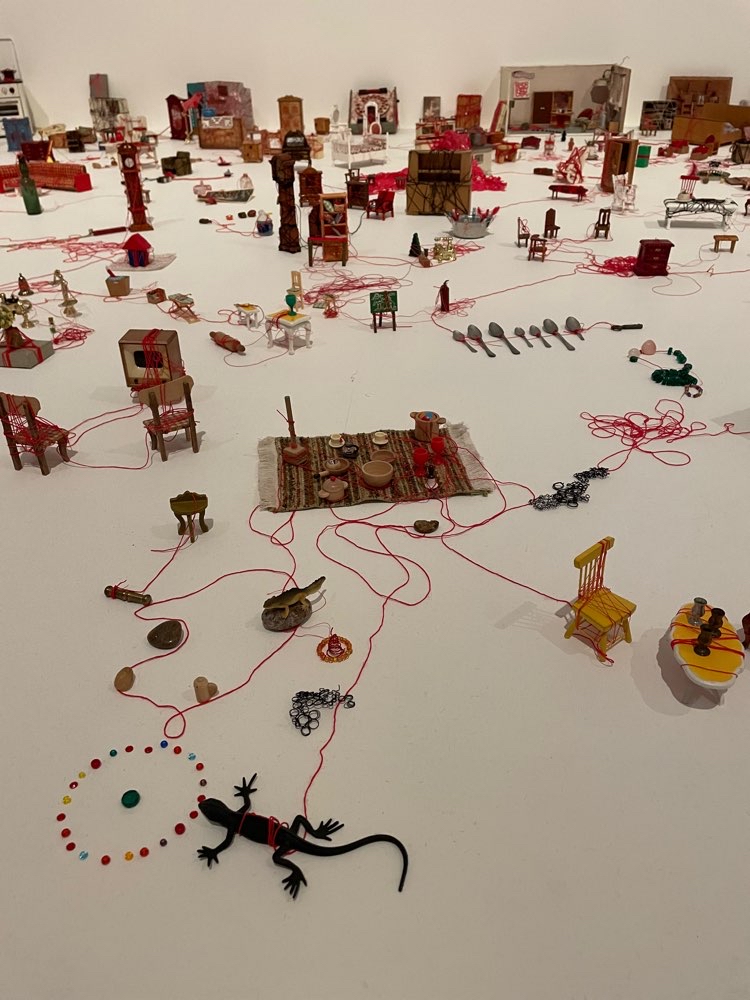 Prosegue, tra altre cose, con L esposizione artistica di oggettini a lei cari, ricordi di infanzia, legati da un laccio rosso che li unisce, tra cui un Geko (mio animale preferito…)