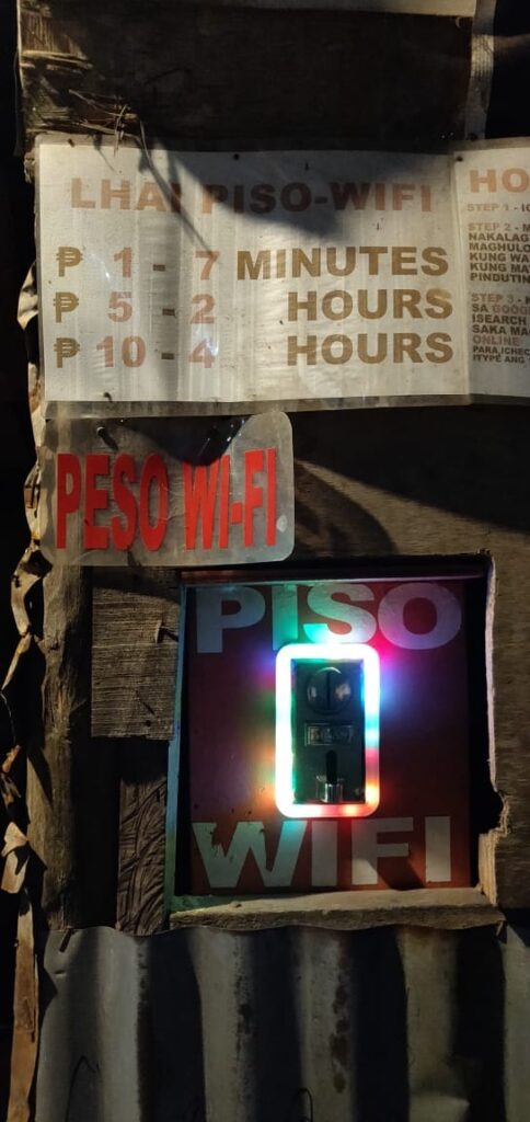 Mi incuriosiscono strane macchinette simili a mini jukebox sparse spesso in giro chiamate PisoWiFi , ci si infila 5 peso (0.1 euro) e si ha segnale per 2 ore!