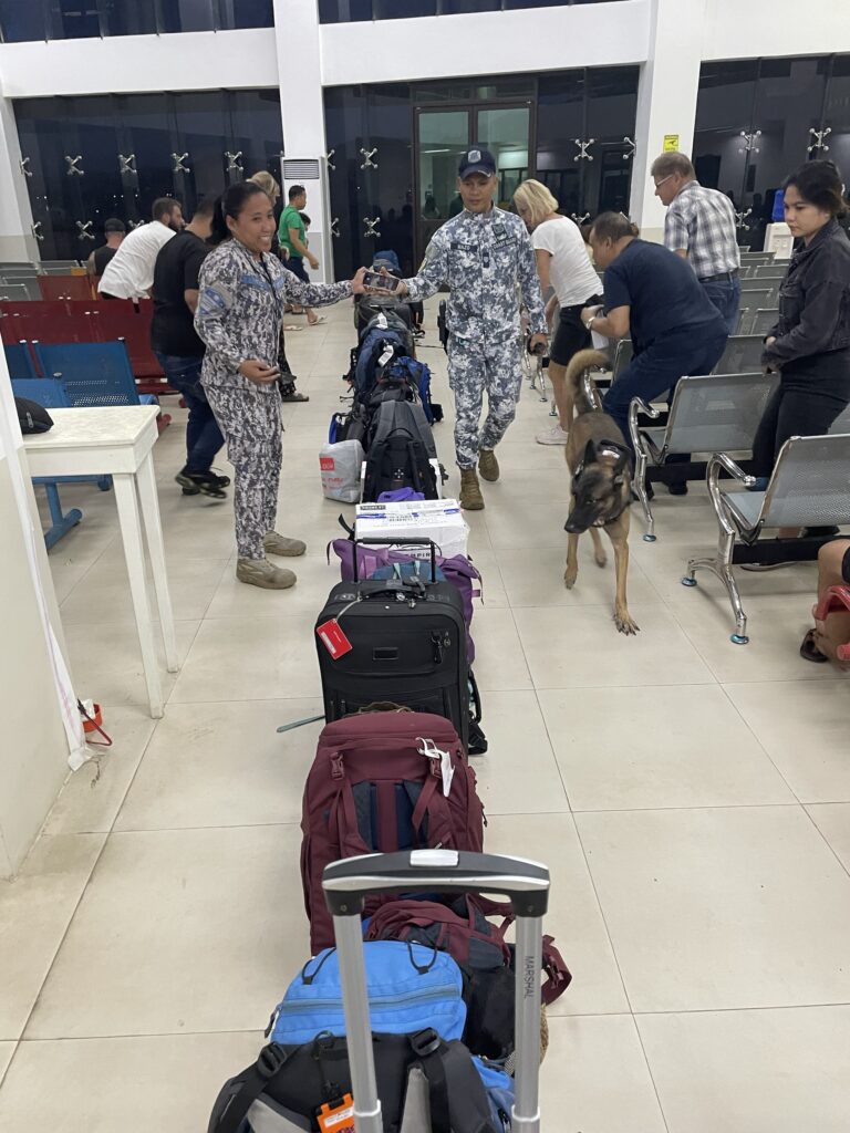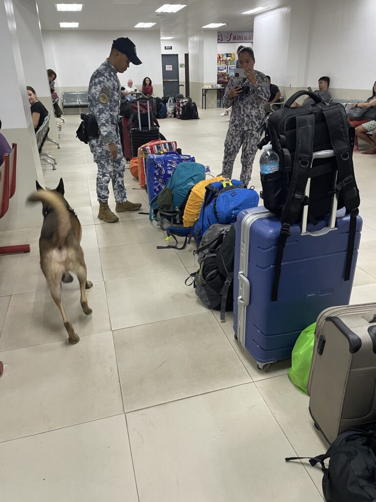 Inizialmente non capisco perché ci fanno metter tutti i bagagli in fila a terra , poi quando arrivano tre militari della Coast Guard con il cane antidroga e pistoloni è tutto chiaro, e filmano pure tutta L annusata!
